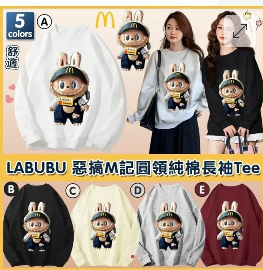 $95件.2件以上$85件.LABUBU 惡搞M記圓領純棉長袖Tee