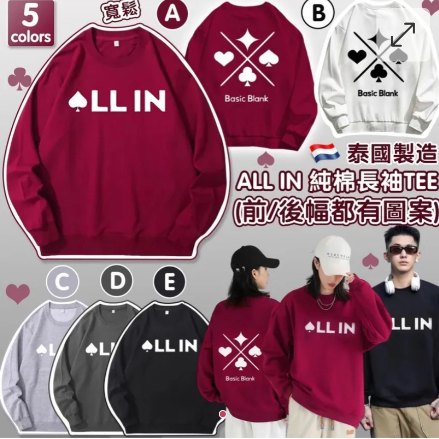 $95件m 2件以上$85件. 泰國製造 ALL IN 純棉長袖Tee (前/後幅都有圖案) ⛔截單日期:2025/10/31 06:00PM 📦預計貨到日:12月中 A. 酒紅色 B. 白色 C. 淺灰色 D. 深灰色 E. 黑色 💟男女同款 💟 100% 毛圈棉 正面/背面都很有街頭感和引人注目的印花圖案 🔹5個尺碼🔹 大約尺寸,以cm計算 🔹5個尺碼🔹 大約尺寸,以cm計算 M碼 衣長70 胸闊120 袖長57 L碼 衣長72 胸闊124 袖長58 XL 碼 衣長74 胸闊128 袖長59 2XL碼 衣長76 胸闊132 袖長60 3XL碼 衣長78 胸闊136 袖長61 📐人手度尺,可能會有1-3cm差異 ==⚠️ 聲明 ⚠️== 1.本貨品為平行進口正貨。 2.所有帖文內容只作分享及參考用途。為免混淆視聽,所有商標或版權均屬有關商品品牌商標的持有人,敬請留意。 3.空運/海運有可能因各種不明因素影響而延誤到貨,所有貨品一經訂購後,如非廠家缺貨,不設取消/退貨/換貨。 4.貨品在運輸途中導致產品包裝外盒有任何損毀凹陷,但不影響其產品本身食用/使用,或有機會不預設外盒出貨,我司不會作任何更換或退款。 5.以上資料及外盒包裝只供參考,商品外盒原廠有更換新包裝權利,一切以實物為準。 6.顏色或因拍攝器材或顯示螢幕等因素而與實物有異,以上圖片及文字僅供參考,一切以實物為準。