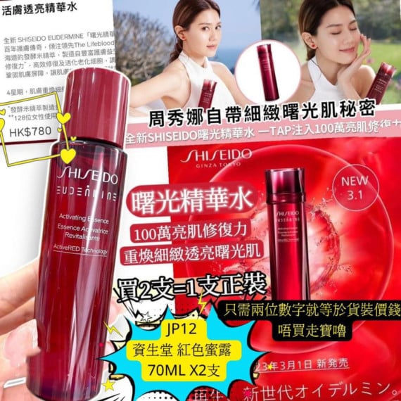 $95套2撙。 Shiseido資生堂全新升級紅色蜜露 / 曙光精華水 70ml / 1 套2 樽 🍊橘子清香味,抗老保濕精華水,清爽不油膩,一抹細滑水嫩有光澤,恢復肌膚緊緻彈性,抗氧,修復維穩肌膚 👍網上稱為 曙光精華水 ⭐買2支差不多等如一支正裝份量 💦買多幾支用嚟濕敷都抵啦 👉1星期,肌膚緊緻有彈性 👉4星期肌膚重煥細緻透亮,時刻自帶曙光 💫全新 SHISEIDO EUDERMINE「曙光精華水」,貫徹SHISEIDO百年護膚傳奇,傾注領先The Lifeblood科研 💪蘊含源自北海道的發酵米精萃,製造自豐富護膚益生菌,注入100萬亮肌修復力^,高效修復及活化老化细胞,調節肌膚微生態平衡,鞏固肌膚屏障,讓肌膚回復自生最好狀態 📜ActiveRED Technology 源自The Lifeblood,憑藉領先The Lifeblood科研,ActiveRED Technology針對肌膚深層的血液流動,促進肌膚新陳代謝,締造不斷自我修復的細緻透亮肌膚 ✨北海道發酵米精萃,蘊含豐富的護膚益生菌,以日本北海道著名品牌七星(Nanatsuboshi)的發芽糙米及Kefir護膚益生菌發酵而成,有效促進表皮層的新陳代謝及水分製造,同時強化血管細胞及肌膚屏障功能 Exp date: 2028/3 截單日期:限量200 預計到貨日:3-4星期