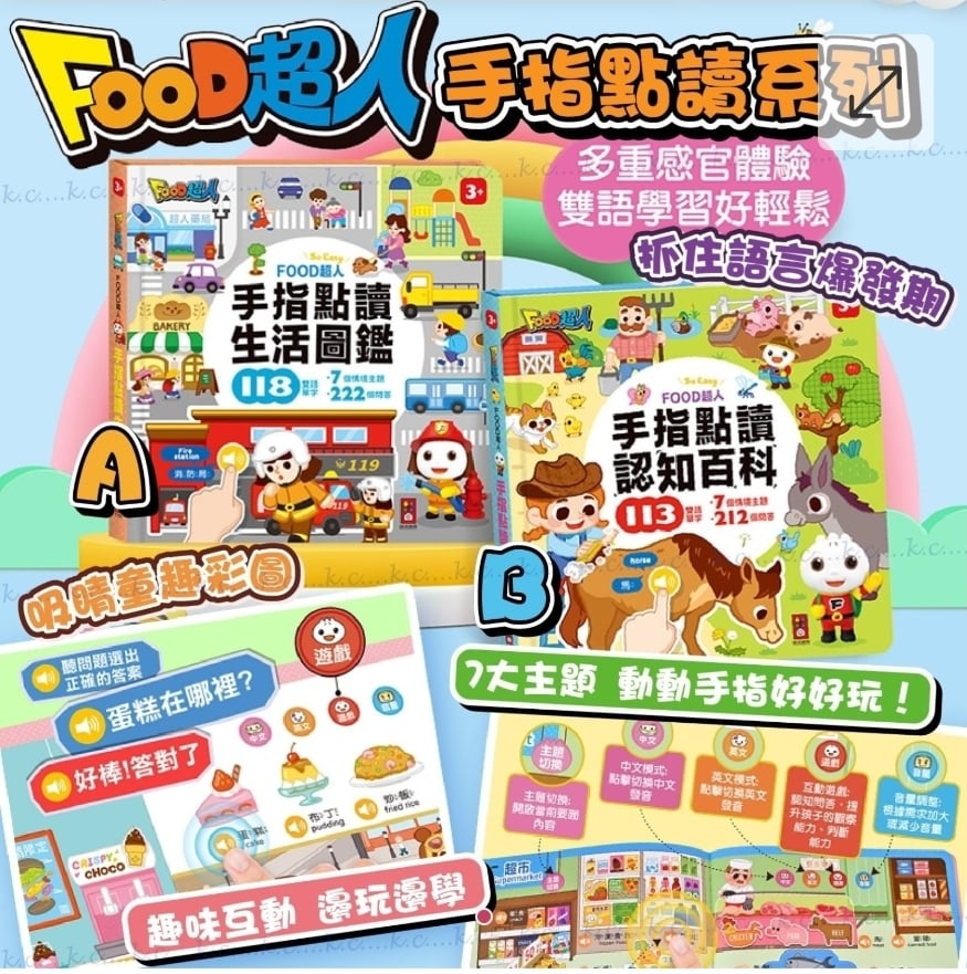 $95本, 2本或以上$85本, 台灣童書 FOOD超人手指點讀系列 ⛔截單日期:2025/12/23 06:00PM 📦預計貨到日:3月中 A.生活圖鑑 B.認知百科 會說話的小手點讀書,翻、看、聽,多重感官體驗,雙語學習好輕鬆! 幼兒語言啟蒙互動有聲書,從單字起跑,建立孩子雙聲道,抓住語言爆發期 FOOD超人最暢銷的有聲書系列,以幼兒生活常見主題情境,搭配生動插圖,加強基礎認知單字量。 簡易切換中、英有聲雙語,專業教師錄製的標準發音,從單字起跑,建立孩子雙聲道! 每單元附問題集互動遊戲,藉由找一找的過程驗收學習成效,再次幫助記憶。 ■商品特色 1.手指點一點,走到哪,學到哪! 只要伸出小手指,按一按就發聲,不需要CD、平板或點讀筆,書本就能開口說話和遊戲互動,不僅增加孩子閱讀和學習樂趣,還能一邊訓練手指小肌肉。讓孩子擺脫3C,養成自主學習好習慣! 2.幼兒雙語學習起跑線 語言學習從「聽」開始,閱讀訓練從「單字」起,本系列幫助孩子熟悉兩種語言轉換,引導英語聽、說入門學習。 ■商品功能 ★標準中英發音,雙語入門首選。 ★聲音問答遊戲,提升專注與記憶力。 ★輔助學齡兒童英語提升和學習興趣。 ★小開本及圓角設計,養成自主閱讀好習慣。 ■商品目錄【七大情境主題】 🔸生活圖鑑 ✅城市✅醫院✅超市✅餐廳✅火車站✅工地✅學校 🔸認知百科 ✅農場✅海洋✅恐龍✅宇宙✅樂器✅職業✅花園 -字體: 繁體 -適讀年齡: 2歲以上 -尺寸:22.2x22.6cm ⚠️需自備電池(AAA)x2⚠️ ==⚠️ 聲明 ⚠️== 1.本貨品為平行進口正貨。 2.所有帖文內容只作分享及參考用途。為免混淆視聽,所有商標或版權均屬有關商品品牌商標的持有人,敬請留意。 3.空運/海運有可能因各種不明因素影響而延誤到貨,所有貨品一經訂購後,如非廠家缺貨,不設取消/退貨/換貨。 4.貨品在運輸途中導致產品包裝外盒有任何損毀凹陷,但不影響其產品本身食用/使用,或有機會不預設外盒出貨,我司不會作任何更換或退款。 5.以上資料及外盒包裝只供參考,商品外盒原廠有更換新包裝權利,一切以實物為準。 6.顏色或因拍攝器材或顯示螢幕等因素而與實物有異,以上圖片及文字僅供參考,一切以實物為準。