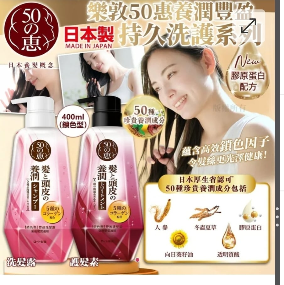 $95枝.2枝或以上$85枝.日本製 樂敦50惠養潤豐盈持久洗護系列(鎖色型) 400ml