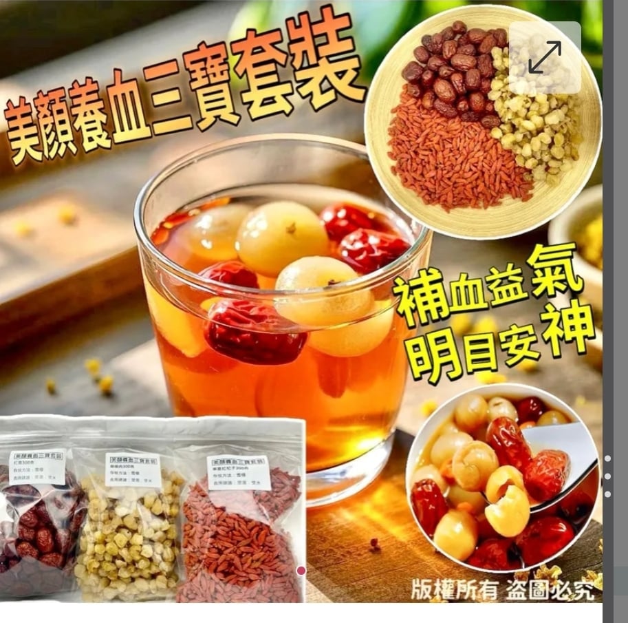 $98套, 2套或以上$88套, 美顏養血三寶套裝 ⛔截單日期:2025/10/07 06:00PM 📦預計貨到日:12月頭 👇👇美顏養血三寶套裝包括👇👇 1️⃣新疆紅棗300克🥇🥇 2️⃣寧夏杞子300克🥇🥇 3️⃣泰國桂圓肉300克🥇🥇 ❤️🔥❤️🔥焗水煲湯煮餸百搭套餐❤️🔥❤️🔥 💞💞養顏益氣補血安神套餐💞💞 市面上補氣血嘅材料份量一般好少,好快就用完🤨今次重磅推介套裝每款300克大包裝、真材實料看得見,想放幾多都可以,一定夠晒味道、真正做到補氣補血、明目安神功效🥰 超值推介💁♀️💁♀️靚女們必買養生補氣血套餐🍵🍵 無論任何季節靚靚們都適宜飲一些益氣養血茶、因為女土們每月一次月經令到身體虛弱🥴,所以日常要適當補下血氣🤗不僅滋補美顏,仲可以補血補氣☺️更能保護肝臟,增強造血功能,對人體健康十分有益🥰紅棗杞子元肉茶絕對係每位女士必備佳品🥰 清香甘甜容易入口,非常好飲同滋潤😍 將所有材料浸泡同沖洗乾淨: 放入熱水浸約15分鐘就飲得喇、焗同煲均可☺️紅棗剪開去核,味道更香甜😊 紅棗杞子圓肉都好適合用嚟煲湯,係煲湯常見嘅湯料嚟🏆🏆煲湯時放啲去煲湯🍵湯水香甜好飲之餘仲健康養生💯 🥇新疆紅棗:養血安神、有助補中益氣、味道香甜濃郁。 🥇寧夏杞子:粒大肉靚、含豐富胡蘿蔔素、維生素A、C等有利眼睛健康的必需營養 🥇泰國桂圓肉:有補益心脾,養血安神,補虛益智等功效,可治療心悸,失眠,精神不振,心煩不安,神經衰弱。 規格:1套 (紅棗、杞子、桂圓肉各300克) 存放方法:雪櫃 食用方法:直接用熱水沖泡、保溫壺焗水 ==⚠️ 聲明 ⚠️== 1.本貨品為平行進口正貨。 2.所有帖文內容只作分享及參考用途。為免混淆視聽,所有商標或版權均屬有關商品品牌商標的持有人,敬請留意。 3.空運/海運有可能因各種不明因素影響而延誤到貨,所有貨品一經訂購後,如非廠家缺貨,不設取消/退貨/換貨。 4.貨品在運輸途中導致產品包裝外盒有任何損毀凹陷,但不影響其產品本身食用/使用,或有機會不預設外盒出貨,我司不會作任何更換或退款。 5.以上資料及外盒包裝只供參考,商品外盒原廠有更換新包裝權利,一切以實物為準。 6.顏色或因拍攝器材或顯示螢幕等因素而與實物有異,以上圖片及文字僅供參考,一切以實物為準。