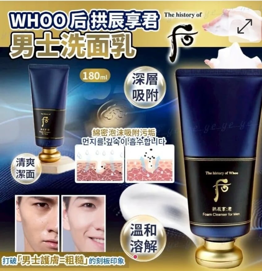 $98支. 2支或以上$88支. 國境內版 WHOO 后 拱辰享君男士洗面乳180ml ⛔截單日期:2025/11/07 06:00PM 📦預計貨到日: 12月中 💥🇰🇷韓國境內限定版登場💥 #WHOO后 #拱辰享君 男士洗面乳180ml 👑男士保養界的皇者登場! 韓國宮廷級保養品牌「The History of Whoo」推出的【拱辰享君男士洗面乳】💫 專為男士肌膚設計,洗出乾淨同時保持潤澤,清爽不繃緊✨ 🌿質地細緻綿密泡沫,能有效帶走多餘油脂同污垢 🌿洗完即刻感覺清爽、乾淨、有活力 🌿淡淡韓方草本香氣,聞落超舒壓~ 🌿每日使用,肌膚更透亮,精神感滿滿✨ 💡連韓國男士都話用過就回唔到轉頭! 出街見客、返工開會都要有「型」同「淨」💪 -規格:180ml -產地:韓國 -注意事項: ※使用後如有不適,請暫停使用並諮詢專業醫師 ※如不小心噴到眼睛,請用清水沖洗10-15分鐘後,請立即就醫諮詢專業醫師 ==⚠️ 聲明 ⚠️== 1.本貨品為平行進口正貨。 2.所有帖文內容只作分享及參考用途。為免混淆視聽,所有商標或版權均屬有關商品品牌商標的持有人,敬請留意。 3.空運/海運有可能因各種不明因素影響而延誤到貨,所有貨品一經訂購後,如非廠家缺貨,不設取消/退貨/換貨。 4.貨品在運輸途中導致產品包裝外盒有任何損毀凹陷,但不影響其產品本身食用/使用,或有機會不預設外盒出貨,我司不會作任何更換或退款。 5.以上資料及外盒包裝只供參考,商品外盒原廠有更換新包裝權利,一切以實物為準。 6.顏色或因拍攝器材或顯示螢幕等因素而與實物有異,以上圖片及文字僅供參考,一切以實物為準。
