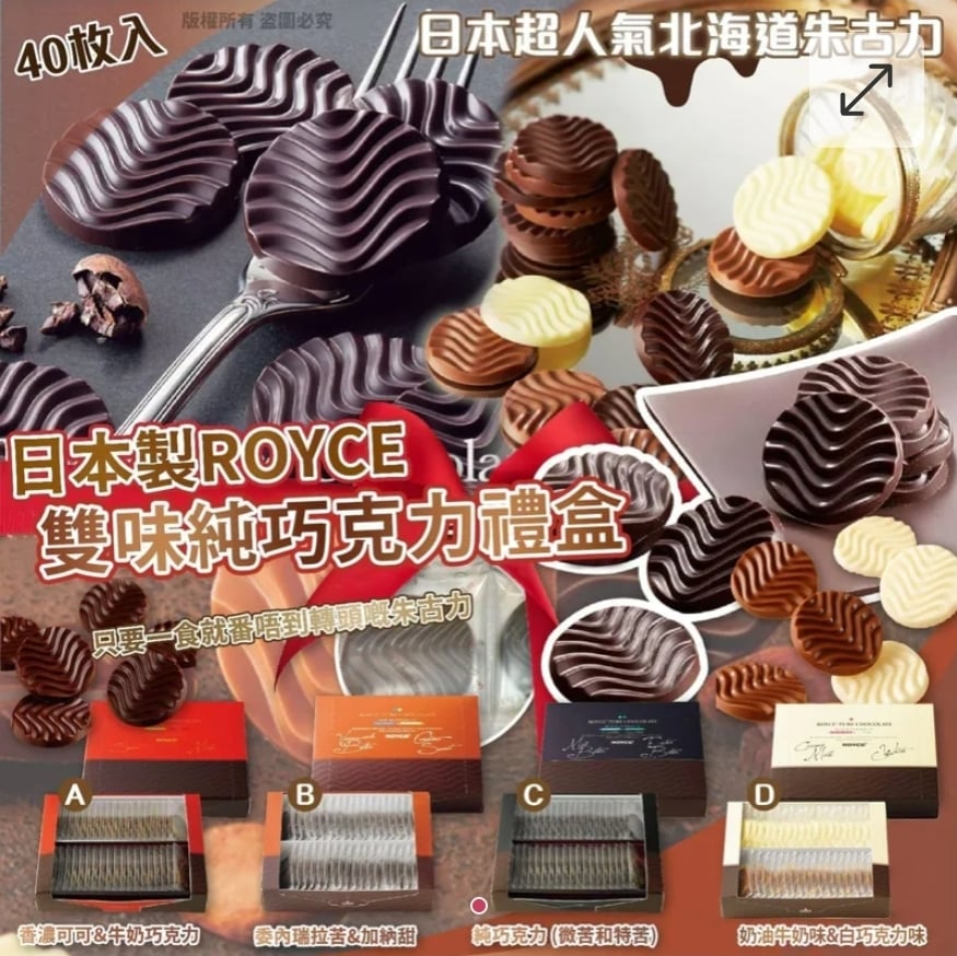 $99盒. 2盒或以上$95盒. 新年團)日本製ROYCE 雙味巧克力驚喜禮盒 40枚入 ⛔截單日期:2025/12/24 06:00PM 📦預計貨到日:2月頭 A.香濃可可&牛奶巧克力 B.委內瑞拉黑巧克力&加納甜巧克力 C.純巧克力 (微苦和特苦) D.奶油牛奶味&白巧克力味 🔥日本超人氣北海道朱古力🍫 只要一食就番唔到轉頭嘅朱古力丫🤩❗ 仲要一盒低至$95💥 🌟A.香濃可可&牛奶巧克力 呢款絕對係最經典嘅好味道喇😋,55%の可可,酸味&苦味協調,口感超清爽❗43%朱古力餘味醇厚~搭配上牛奶嘅味道,香氣一直係口中蔓延✨ 🌟B.委內瑞拉黑巧克力&加納甜巧克力 享受黑朱古力の美🍫,68%朱古力嘅香氣同微苦嘅味道恰到好處🤩,59%加納甜巧克力,完全可以一粒接一粒噤食! 🌟C.純巧克力 (微苦和特苦) 80% 和 90% 高濃度套裝,絕對係唔鍾意食甜品嘅最愛💓,接近原汁原味嘅可可,食落後味道好清爽,帶著嘅微酸&澀味會帶出微微牛奶醇香🥛 🌟D.奶油牛奶味&白巧克力味 奶油牛奶(可可含量37%)口感濃鬱醇厚、餘味悠長的香氣的。 白巧克力(可可含量37%)奶味後散發出清爽甜味。 ■產地:日本 ■內容量:40枚入 ■賞味期限:由生產日起3個月(到手約1-2個月) ==⚠️ 聲明 ⚠️== 1.本貨品為平行進口正貨。 2.所有帖文內容只作分享及參考用途。為免混淆視聽,所有商標或版權均屬有關商品品牌商標的持有人,敬請留意。 3.空運/海運有可能因各種不明因素影響而延誤到貨,所有貨品一經訂購後,如非廠家缺貨,不設取消/退貨/換貨。 4.貨品在運輸途中導致產品包裝外盒有任何損毀凹陷,但不影響其產品本身食用/使用,或有機會不預設外盒出貨,我司不會作任何更換或退款。 5.以上資料及外盒包裝只供參考,商品外盒原廠有更換新包裝權利,一切以實物為準。 6.顏色或因拍攝器材或顯示螢幕等因素而與實物有異,以上圖片及文字僅供參考,一切以實物為準。