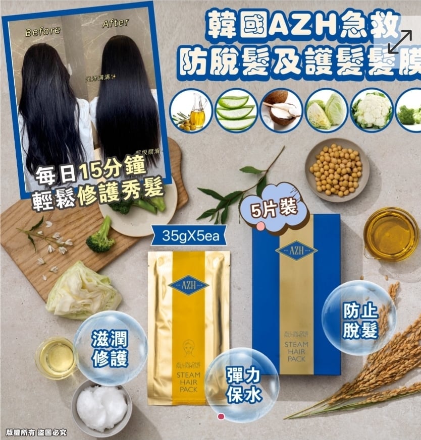 $99盒.2盒或以上:$90盒.韓國 AZH 急救防脫髮及護髮髮膜 (1盒5片)
