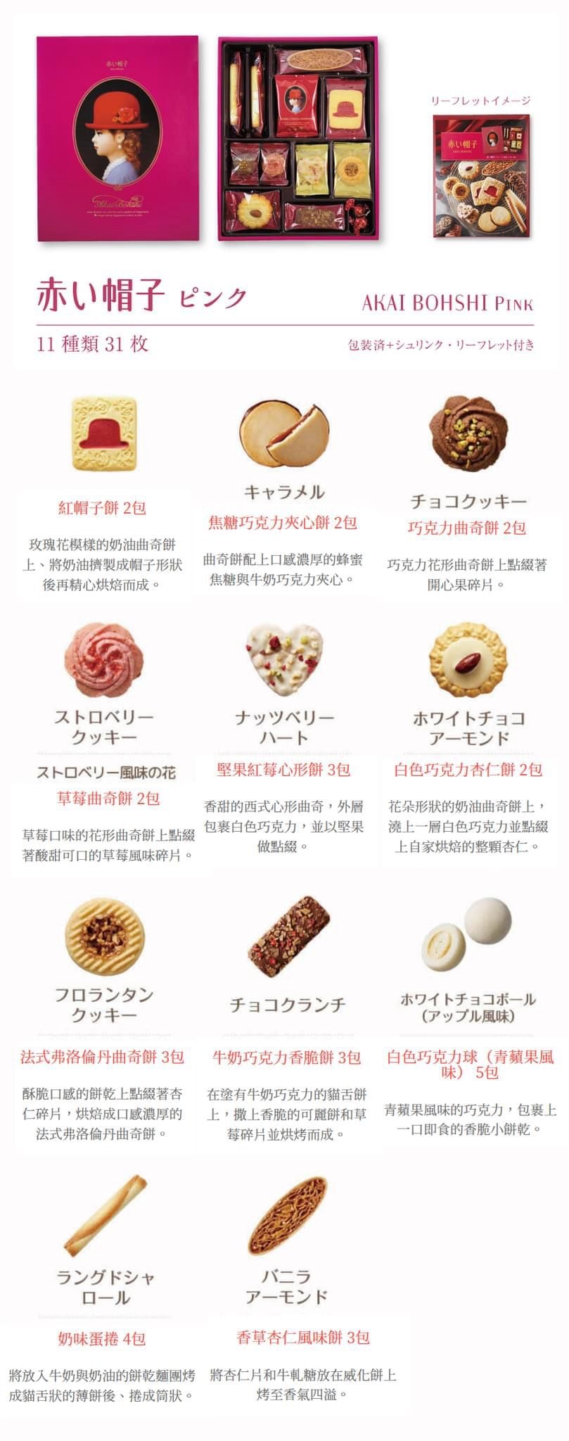 紅帽子餅x2、焦糖巧克力夾心餅x2、巧克力曲奇餅x2、草莓曲奇餅x2、堅果紅莓心型餅x3、白色巧克力杏仁餅x2、、法式佛洛倫丹曲奇餅x3、牛奶巧克力香脆餅x3、白色巧克力球(青蘋果)x5、奶味蛋捲x4、香草杏仁風味餅x3