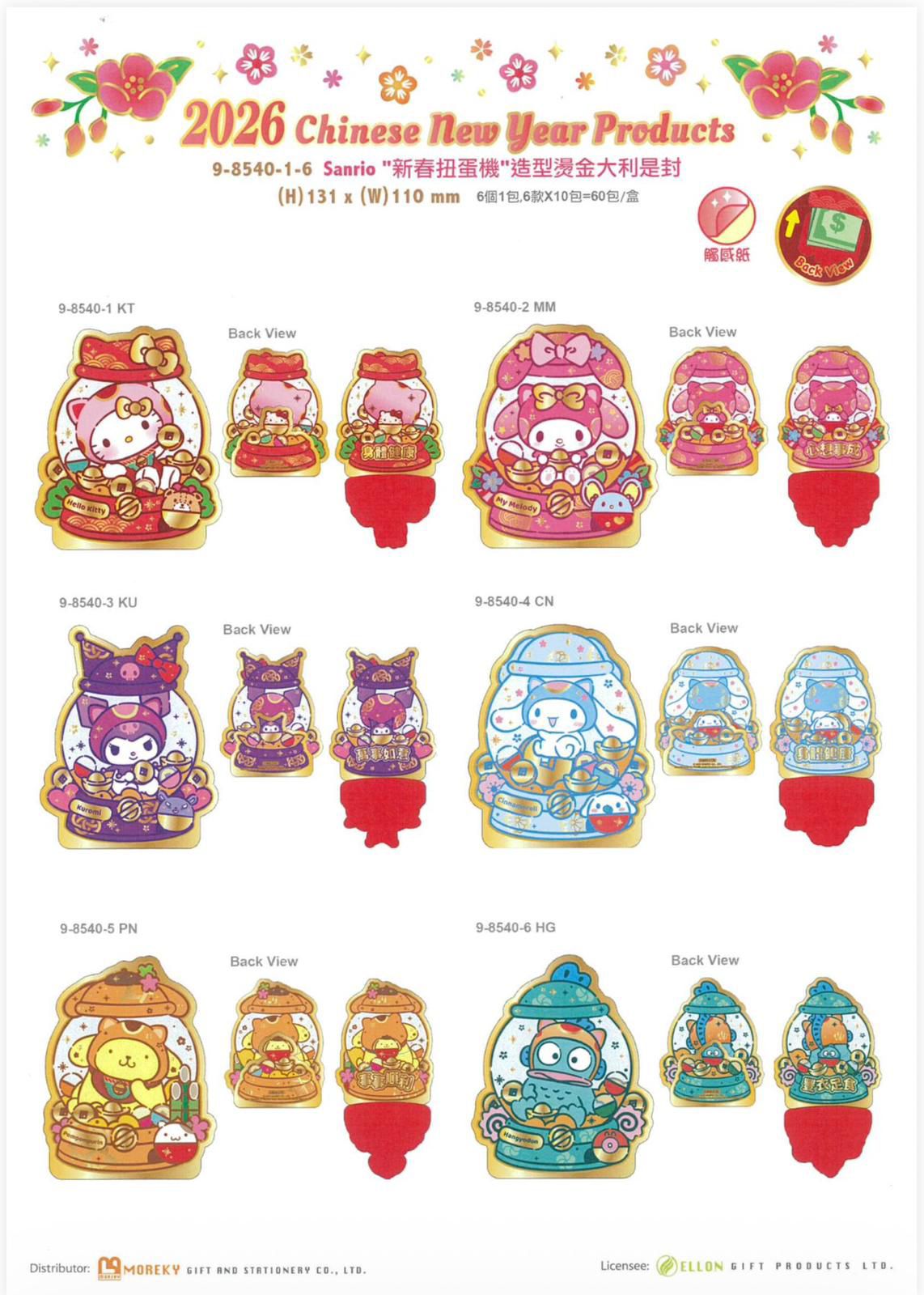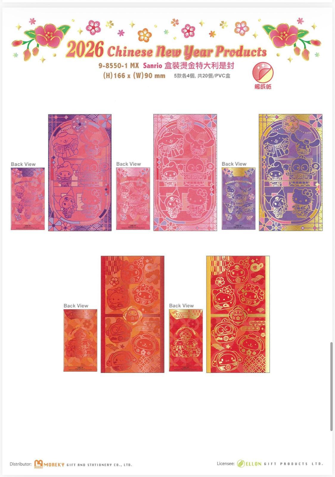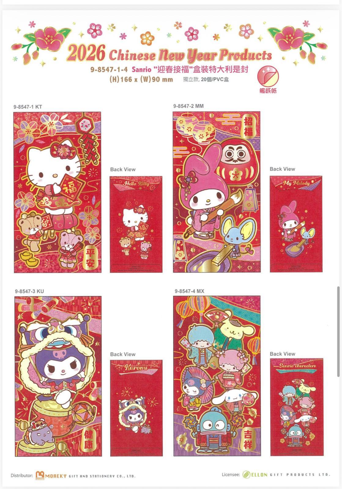 多款選擇/2套起各减$10。 Sanrio 2026年港版利是封系列 截單日期:長訂 逢星期一11am / 售完即止 *最後截單日期:12/1 22pm* 預計到貨日:1月下2月上 款式:如圖 落單請註明系列➕編號➕卡通人物🔢❣️ 🧧9-8540-1-6 新春扭蛋機造型燙金大利是封 (1包6個) 💰45 🧧9-8541-1-6 新春夾公仔機造型燙金大利是封(1包6個) 💰45 🧧9-8542-1-6 手拉賀語燙金大利是封 (1包6個) 💰45 🧧9-8543-1-4 招財花花利是封 (1包6個) 💰45 🧧9-8544-1-6 新禧結緣燙金大利是封 (1包8個) 💰38 🧧9-8545-1-4 喜慶相伴迎新春特大利是封 (1包4個) 💰38 🧧9-8546-1-6歡度新春盒裝大利是封 (1盒30個) 💰75 🧧9-8547-1-4迎春接福盒裝特大利是封 (1盒20個) 💰78 🧧9-8550-1盒裝燙金特大利是封 (1盒20個) 💰78 🧧9-8551-1 燙金激凸賀封套裝 (1盒16個) 💰83