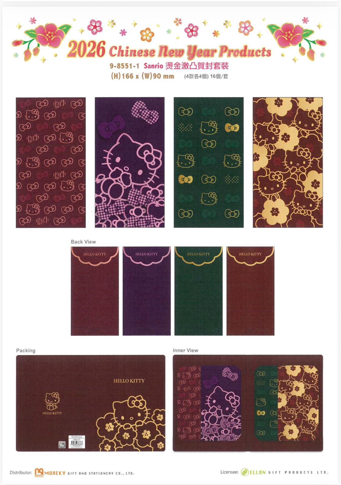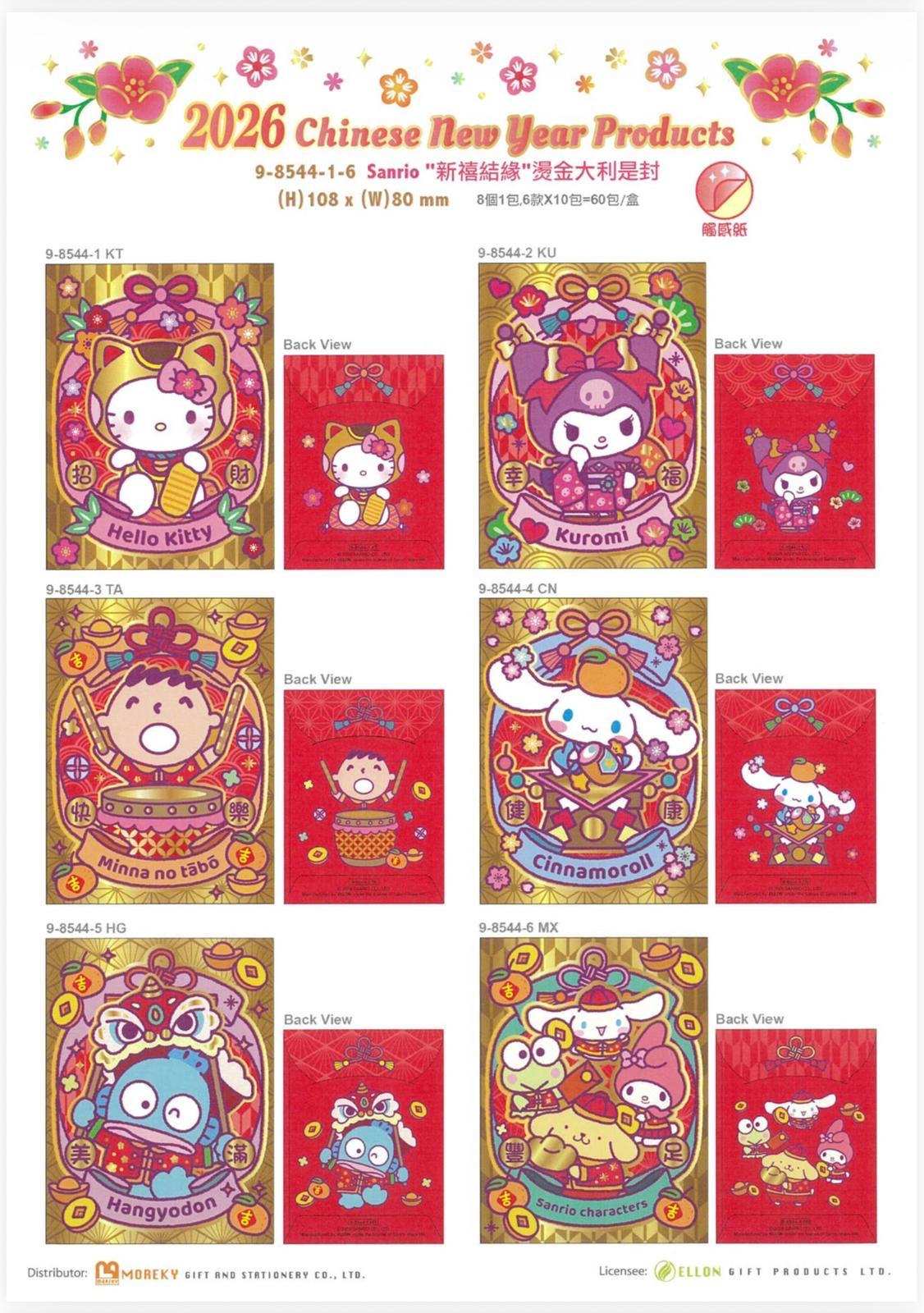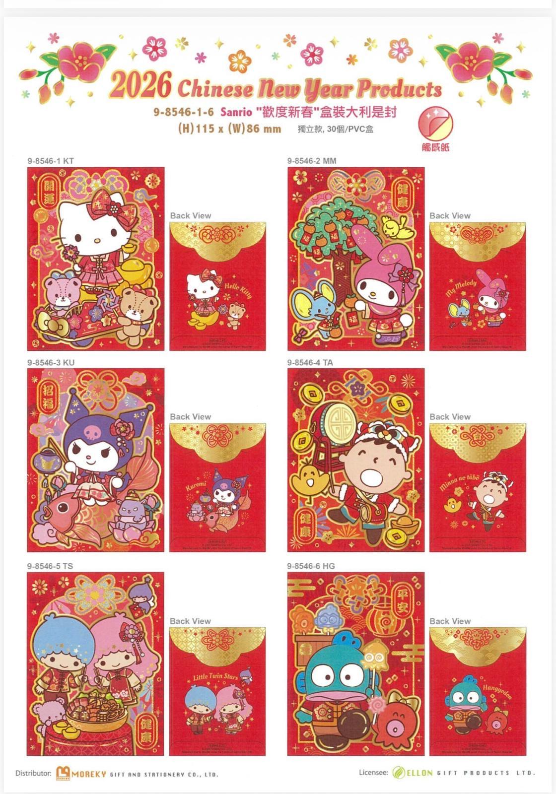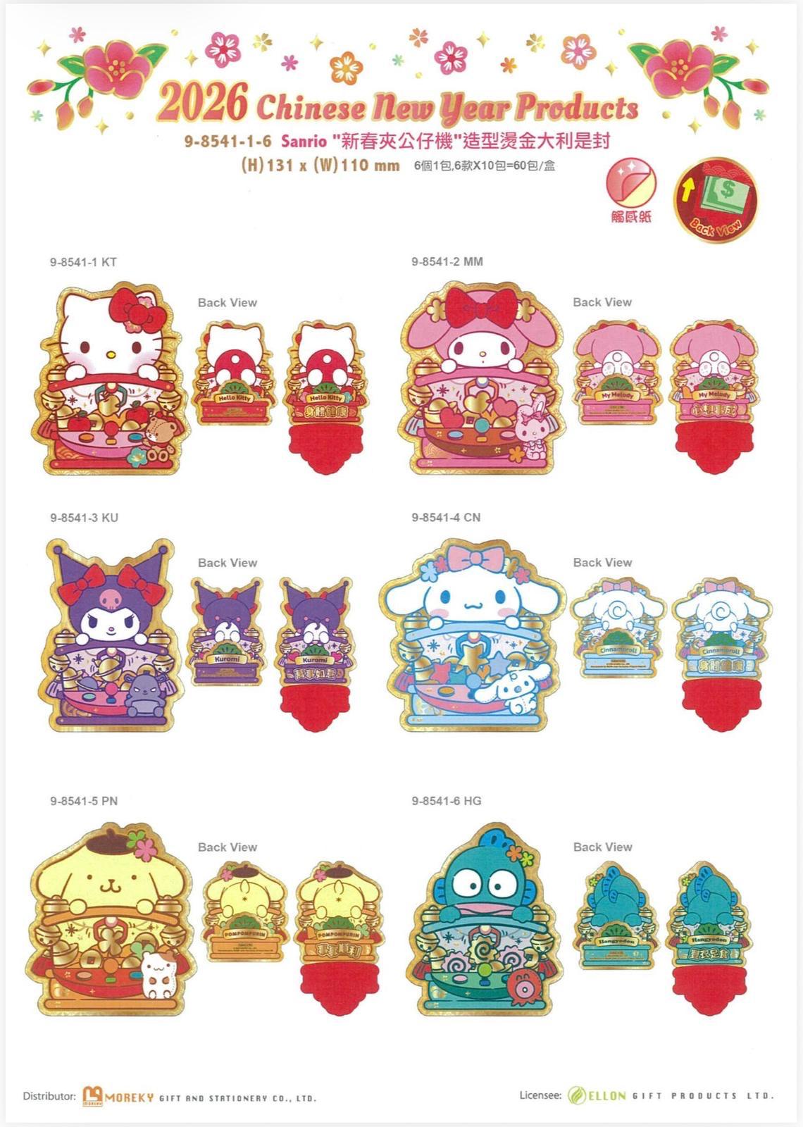 多款選擇/2套起各减$10。 Sanrio 2026年港版利是封系列 截單日期:長訂 逢星期一11am / 售完即止 *最後截單日期:12/1 22pm* 預計到貨日:1月下2月上 款式:如圖 落單請註明系列➕編號➕卡通人物🔢❣️ 🧧9-8540-1-6 新春扭蛋機造型燙金大利是封 (1包6個) 💰45 🧧9-8541-1-6 新春夾公仔機造型燙金大利是封(1包6個) 💰45 🧧9-8542-1-6 手拉賀語燙金大利是封 (1包6個) 💰45 🧧9-8543-1-4 招財花花利是封 (1包6個) 💰45 🧧9-8544-1-6 新禧結緣燙金大利是封 (1包8個) 💰38 🧧9-8545-1-4 喜慶相伴迎新春特大利是封 (1包4個) 💰38 🧧9-8546-1-6歡度新春盒裝大利是封 (1盒30個) 💰75 🧧9-8547-1-4迎春接福盒裝特大利是封 (1盒20個) 💰78 🧧9-8550-1盒裝燙金特大利是封 (1盒20個) 💰78 🧧9-8551-1 燙金激凸賀封套裝 (1盒16個) 💰83