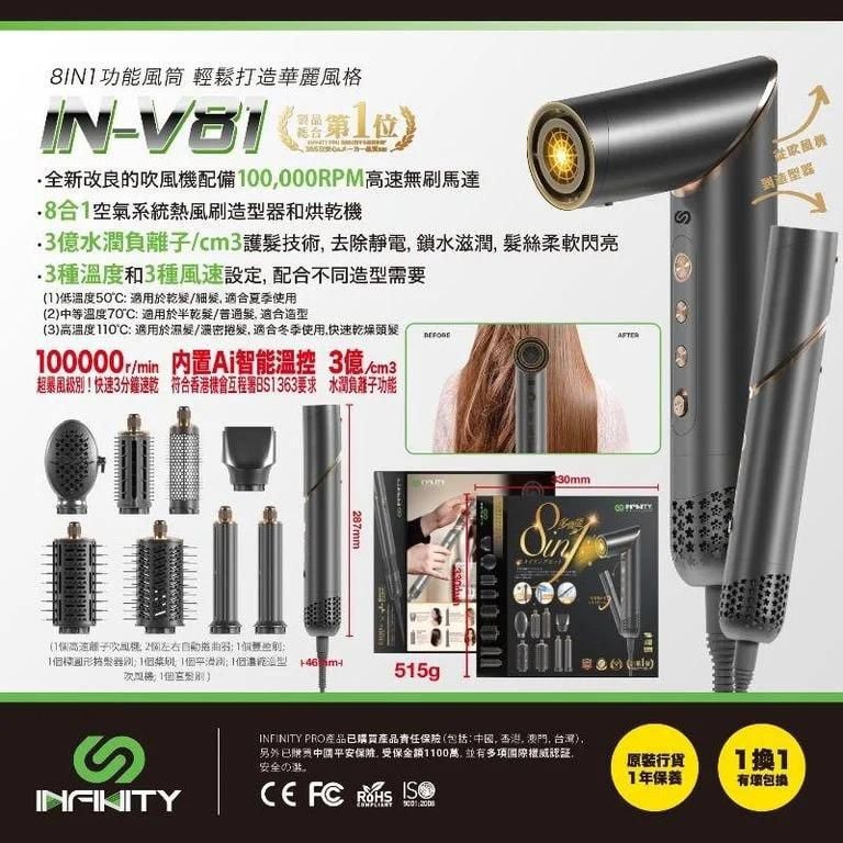 數量有限 售完即止。$599套。INFINITY V81 8-in-1 摺疊式頭髮造型風筒🌬️