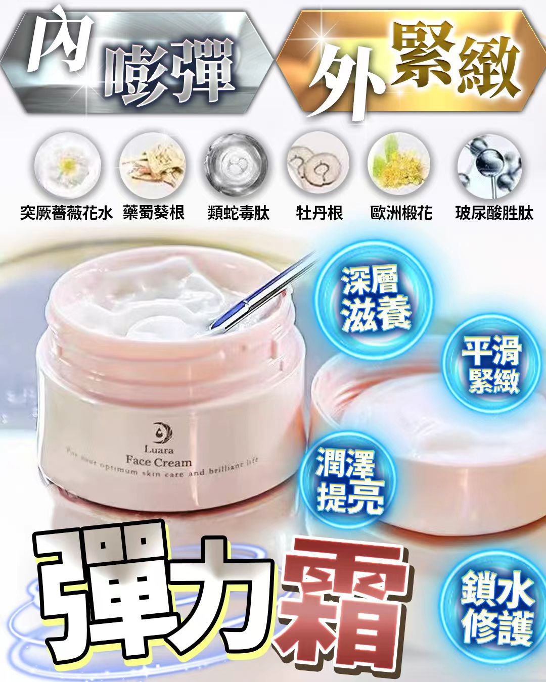 日本製彈力霜 $198件。2件起$188件。 冬天面霜你要識簡 "內外兼修"抗初老秋冬面霜 ,肌膚水分更易流失乾燥易導致的乾紋、卡粉、暗沈⋯⋯ #彈力霜 一抹爆水 狂泵膠原 撐起蘋果肌 採用膠胶囊 配方 ✅淡紋緊致✅ 重塑輪廓 ✅防禦衰老✅ 回春彈力 ✅擊褪色素色斑✅抗氧祛黃 * 類蛇毒勝肽 (Syn-Ake):這是一種模擬蛇毒蛋白活性的合成三勝肽,能透過抑制神經傳導,減弱肌肉收縮,從而有效撫平動態表情紋和細紋,達到顯著的抗皺效果。 * 玻尿酸勝肽:玻尿酸本身是強效的保濕成分,能吸收並鎖住大量水分,使皮膚水潤飽滿。與勝肽結合後,通常指小分子的膠原蛋白勝肽,更容易被皮膚吸收,有助於提升皮膚彈性和修復能力。 * 突厥薔薇花水:具有舒緩和保濕作用,常用於鎮靜敏感或受刺激的皮膚,並提供天然的香氣。 * 牡丹根 (Paeonia Suffruticosa Root Bark Extract):富含抗氧化劑,具有抗炎、美白和提亮膚色的特性。它可以幫助減少色素沈澱,改善膚色不均,並保護皮膚免受自由基傷害。 * 歐洲嫩花 (可能指特定植物精華,例如橙花):通常具有舒緩、提亮和平衡膚色的作用,具體功效取決於確切的植物種類。 * 藥蜀葵根 (Marshmallow Root Extract):以其強大的舒緩特性而聞名,有助於減少皮膚發紅、腫脹和刺激,特別適合敏感肌膚,具有顯著的抗炎效果。 50g 日本製