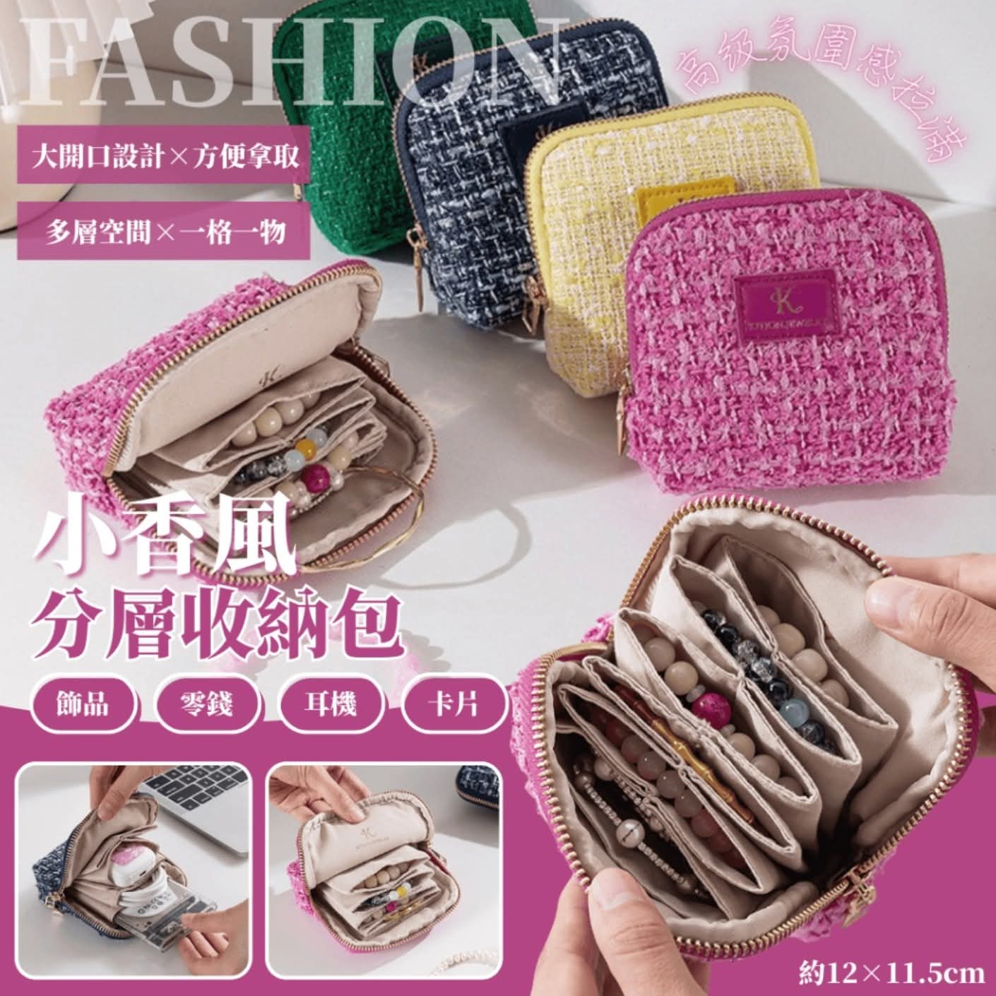 聖誕節小禮物。 小香風首飾分層收納包 $48件。2件起$38件。 女孩們注意啦~💎仙女必備的小巧百寶袋 💼 首飾太多常常打結?😕找耳環鑽半天?🤔 ❤️幫你一秒解決~ ✔ 多層空間 分類收納 一目了然 👀 ✔ 大開口設計 → 拿取超方便 💪 ✔ 一格一物 💎 首飾都有專屬保護 ✔ 經典小香風格紋 高級氛圍感加滿 ✔ 小巧便攜 → 出門旅行也能帶走 ✈️ ★ 用途:收納首飾·化妝品 · 零錢 💰 隨心放! 隨手一打開 ➡️ 整套齊齊整整應應亮 ✨ 重量:約300g 材質:滌綸 尺寸:約 12×11.5cm 顏色:紫 / 黃 / 綠 / 藏青