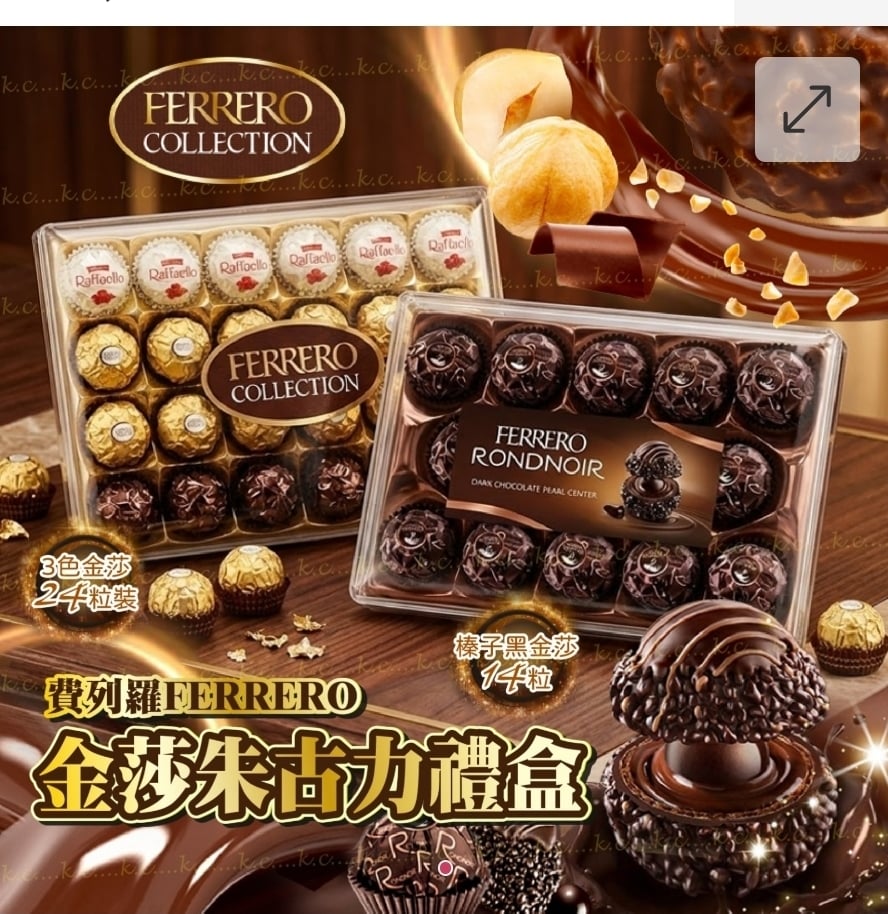 買2盒起每盒優惠$10/盒 德國冬季限定 Ferrero 頂級黑金莎/雜錦禮盒 ⛔截單日期:2025/12/16 06:00PM 📦預計貨到日: 2月頭 A.黑金莎(1盒14入) $95盒 B.雜錦(1盒24入) $118盒 買2盒起每盒優惠$10/盒 🎄🇩🇪 德國冬季限定|Ferrero 頂級黑金莎 / 綜合禮盒 冬天就要甜蜜過冬!德國直送,頂級手工巧克力,送禮自用都超高級✨ 🍫 黑金莎|黑巧克力控必試 ✨ 漂亮拉花豪華黑巧克力圓頂 ✨ 濃郁巧克力厚片底部 ✨ 精緻可可奶油內餡 ✨ 鬆脆威化餅乾 ✨ 黑巧克力裹上珍珠杏仁粒 → 每一口都層次滿滿,口感香濃脆滑,真正奢華享受! 🍬 綜合禮盒|一次滿足多種口味 ✔ FERRERO ROCHER 金色經典金莎 – 牛奶榛子朱古力 ✔ FERRERO RONDNOIR 朗莎 – 精緻特濃黑朱古力 ✔ CONFETTERIA RAFFAELLO 雪莎 – 椰子果仁糖 → 牛奶、黑巧克力、椰子果仁三重享受,送禮格調爆表! 🎁 送禮自用必備|節日限定 聖誕拜年、節日送禮、辦公室分享都無敵適合,打開就超有儀式感💖 -規格:黑金莎14入/綜合24入 -保存期限: 黑金莎14入:2026年04月 綜合24入:2026年05月 -過敏原資訊: ※本產品含麩質之穀物、牛奶、蛋、大豆及其製品,不適合其過敏體質食用。 ※本產品與其它含有魚類、亞硫酸鹽、芒果、堅果與芝麻種子的產品於同一工廠生產,食物過敏者請留意。 ==⚠️ 聲明 ⚠️== 1.本貨品為平行進口正貨。 2.所有帖文內容只作分享及參考用途。為免混淆視聽,所有商標或版權均屬有關商品品牌商標的持有人,敬請留意。 3.空運/海運有可能因各種不明因素影響而延誤到貨,所有貨品一經訂購後,如非廠家缺貨,不設取消/退貨/換貨。 4.貨品在運輸途中導致產品包裝外盒有任何損毀凹陷,但不影響其產品本身食用/使用,或有機會不預設外盒出貨,我司不會作任何更換或退款。 5.以上資料及外盒包裝只供參考,商品外盒原廠有更換新包裝權利,一切以實物為準。 6.顏色或因拍攝器材或顯示螢幕等因素而與實物有異,以上圖片及文字僅供參考,一切以實物為準。
