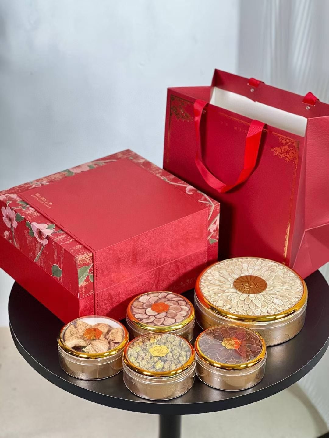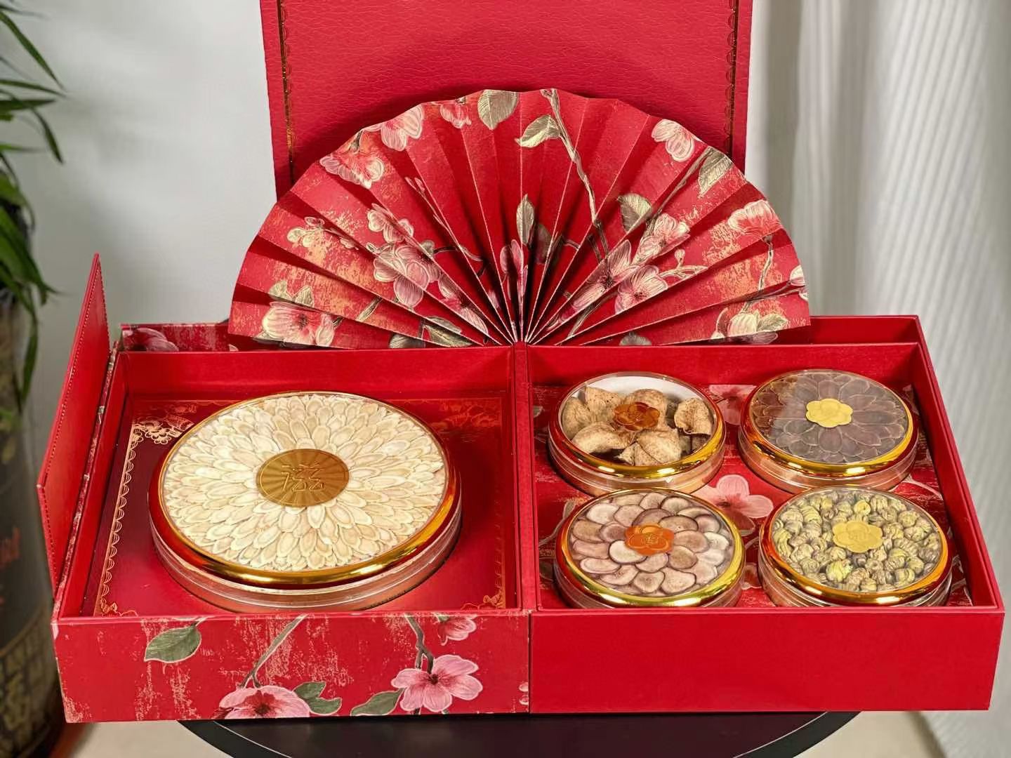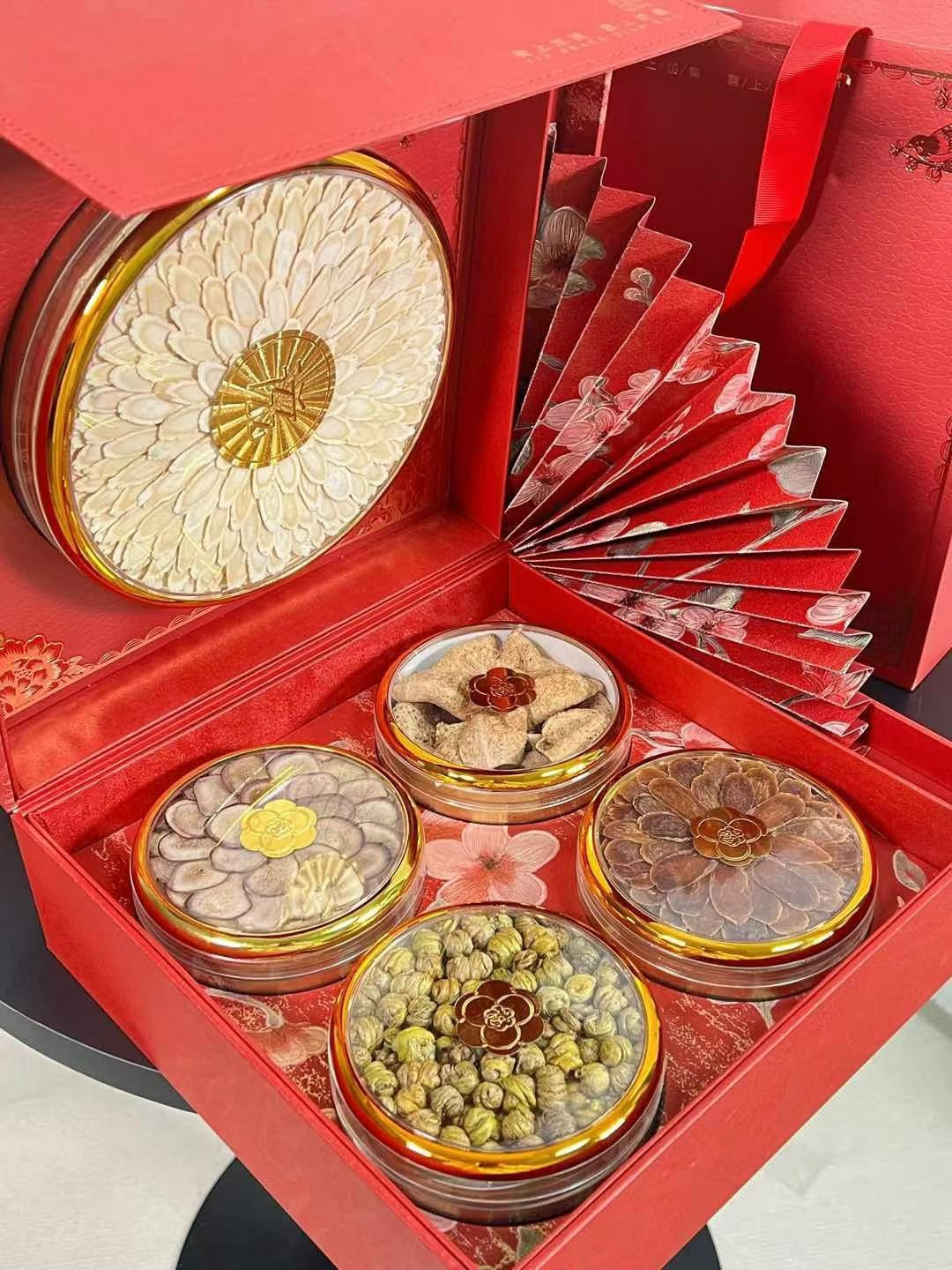 錦上添花開扇五拼禮盒 $280盒。混款2盒起各减$ 1 0。 1月24截,2月頭到 ▫️強烈推薦這款‼️✔️ ▫️錦上添花開扇五拼禮盒 ✅西洋參+陳皮+紅參+鹿茸+石斛 🧡質感滿滿超有新意! 🪭錦上添花好運齊 🪭團圓喜氣揚 花旗參片80克➕陳皮20克➕高麗參片50克➕鹿茸50克➕石斛50克 禮盒尺寸:29*38*16cm