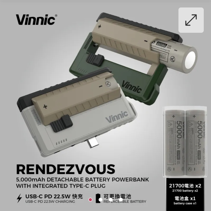 2件起各减$ 10。Vinnic Rendezvous 5000mAh可換電Type-C直插式雙輸出行動電源(附21700電池兩枚)