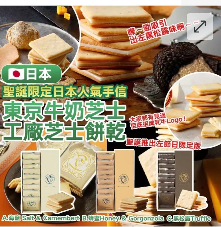 2件起各減$ 1 0。日本人氣手信東京牛奶芝士工廠芝士餅乾 ⛔截單日期:2025/10/30 06:00PM 📦預計貨到日:12月中 A) 海鹽 Salt & Camembert$118. B) 蜂蜜 Honey & Gorgonzola$118 C) 黑松露 Truffle $128 ✨聖誕限定日本 ✨空運直送~ ✨快閃團 嘩~勁吸引,出左黑松露味啊~~ 以車打芝士🧀和北海道牛奶🥛為底料,搭配上等食材「黑松露🧆」。松露香氣加上濃郁芝士製成朱古力夾心餅,簡直高級享受😋 日本人氣手信東京牛奶芝士工廠,相信大家都有見過佢既招牌乳牛Logo!今年聖誕推出左節日限定版,一盒9塊。 💥食用期限:製造期起2個月以上 💥原產國:Japan ==⚠️ 聲明 ⚠️== 1.本貨品為平行進口正貨。 2.所有帖文內容只作分享及參考用途。為免混淆視聽,所有商標或版權均屬有關商品品牌商標的持有人,敬請留意。 3.空運/海運有可能因各種不明因素影響而延誤到貨,所有貨品一經訂購後,如非廠家缺貨,不設取消/退貨/換貨。 4.貨品在運輸途中導致產品包裝外盒有任何損毀凹陷,但不影響其產品本身食用/使用,或有機會不預設外盒出貨,我司不會作任何更換或退款。 5.以上資料及外盒包裝只供參考,商品外盒原廠有更換新包裝權利,一切以實物為準。 6.顏色或因拍攝器材或顯示螢幕等因素而與實物有異,以上圖片及文字僅供參考,一切以實物為準。