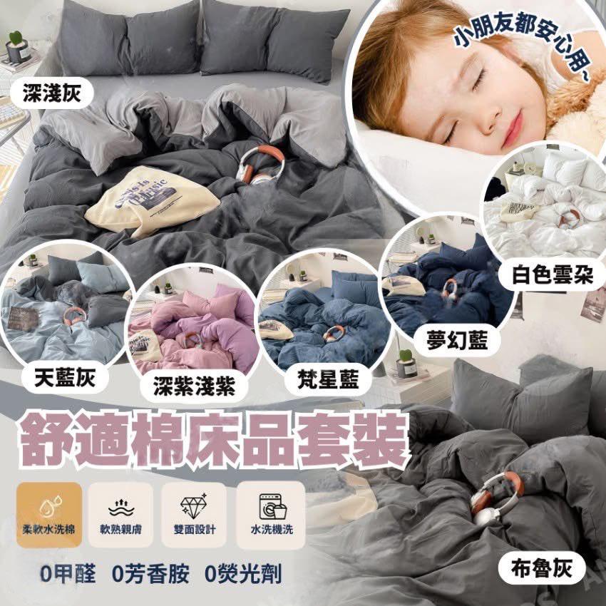 精選A類親膚水洗棉床品套裝,以雙面設計、柔軟透氣嘅面料,配合貼心細節,為你打造一個可以徹底放鬆、安心睡眠嘅療癒空間~