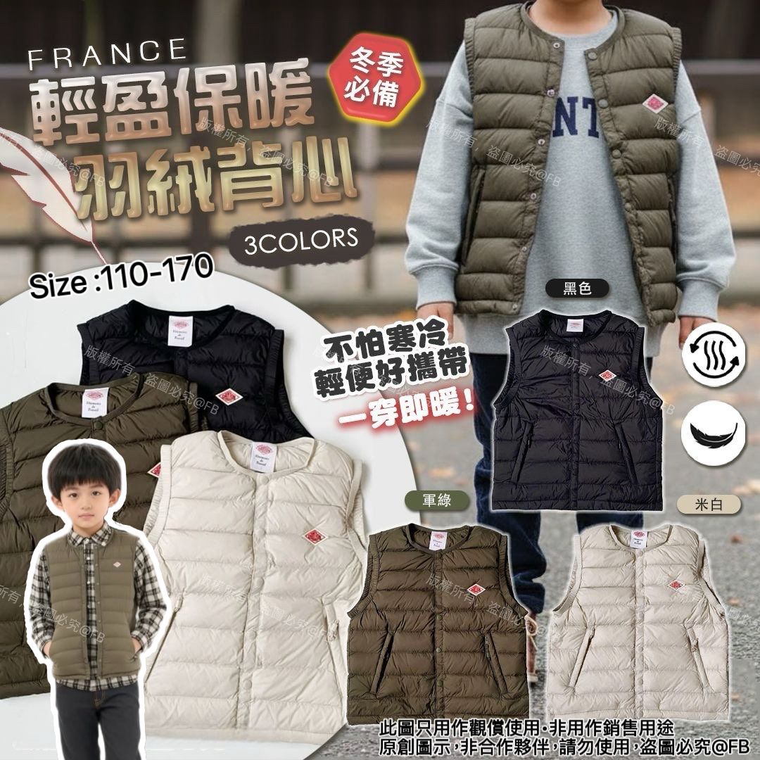 2件起各減$ 10。 Dan*ton輕盈保暖羽絨背心 $156 (160-170) $147(110-150) 截單日:11月25日2359 到貨日:預計1月初 A. 米白 B. 軍綠色 C. 黑色 Size: 110/120/130/140/150/160/170 #快閃優惠🔥 #保暖又輕盈😍 #冬季必備❄️ 🔥🔥冬天最緊要保暖 💁🏻♀️尤其係膊頭位,😷一定唔可以凍親。 所以一件保暖又輕盈嘅羽絨背心🪶 🥰就絕對唔少得啦‼️ 顏色: 米白/軍綠色/黑色 尺寸(cm): 110 衣長39 胸圍76 120 衣長41 胸圍80 130 衣長44胸圍84 140 衣長48胸圍89 150 衣長52 胸圍94 160 衣長56 胸圍100 170 衣長60 胸圍106 ⚠️温馨提示:基於衛生問題,所有貼身物品除品質問題外,其他理由一律不設退換,敬請留意! ==⚠️ 聲明 ⚠️== 1. 本公司並沒持有任何品牌之版權。所有商標及版權均屬該品牌持有人, 圖片及資料轉載只作分享用途,敬請留意 2. 以上圖片及文字僅供參考,一切以實物為準 3. 空運/海運有可能因各種不明因素影響而延誤到貨,如非缺貨,不設退貨/換貨/退款,不接急單,如不能接受請勿下單。 5. 貨品在運輸途中導致產品包裝外盒有任何損毀凹陷,但不影響其產品本身食用/使用,或有機會不預設外盒出貨,本公司不會作任何更換或退款,介意者請慎購!