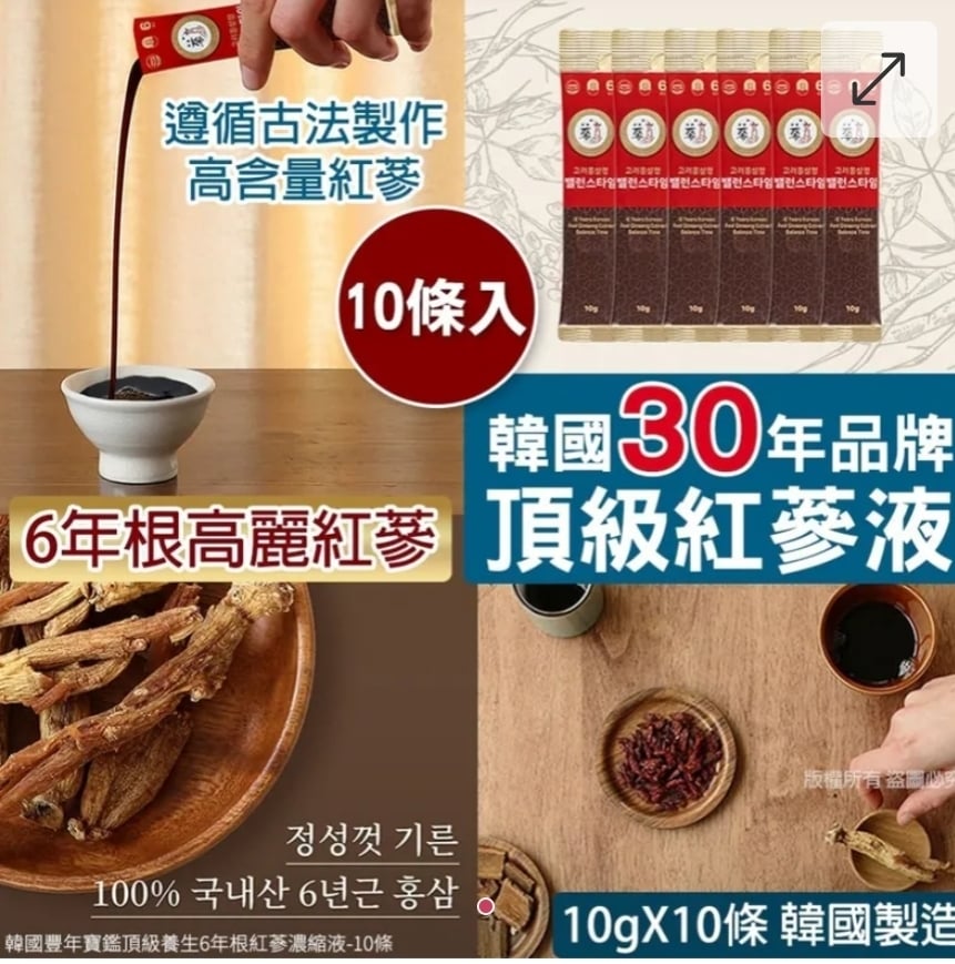 2包$68。 韓國豐年寶鑑頂級養生6年根紅蔘濃縮液 (1包10條) ⛔截單日期:2025/12/22 06:00PM 📦預計貨到日:2月尾 30年的韓國國民品牌👑 超高CP值的豐年寶鑑頂級6年紅蔘液👍一次喝整天好活力~天天喝長期最養生🥰 遵循古法製作高含量的紅蔘😋搭配多種藥材調配製造❗ 具有✅補氣✅滋陰✅益血✅強心✅健胃✅鎮靜等功效 豐年寶鑑,讓你擁有整天黃金好時光💖深受韓國大眾喜愛的國民紅蔘液💖 💟食用方法 一日一次,一次一條 產品採用獨立包裝喔,可以用手撕開口後直接服用 根據個人喜好可以直接食用或是混入溫水,涼水中食用 -規格:1包10條,每條10g -產地:韓國 -OPP袋裝 ==⚠️ 聲明 ⚠️== 1.本貨品為平行進口正貨。 2.所有帖文內容只作分享及參考用途。為免混淆視聽,所有商標或版權均屬有關商品品牌商標的持有人,敬請留意。 3.空運/海運有可能因各種不明因素影響而延誤到貨,所有貨品一經訂購後,如非廠家缺貨,不設取消/退貨/換貨。 4.貨品在運輸途中導致產品包裝外盒有任何損毀凹陷,但不影響其產品本身食用/使用,或有機會不預設外盒出貨,我司不會作任何更換或退款。 5.以上資料及外盒包裝只供參考,商品外盒原廠有更換新包裝權利,一切以實物為準。 6.顏色或因拍攝器材或顯示螢幕等因素而與實物有異,以上圖片及文字僅供參考,一切以實物為準。