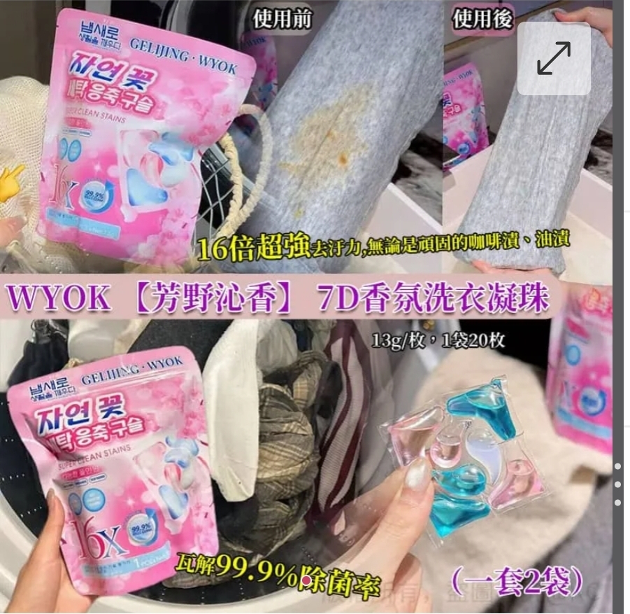 2套4包共80粒$68, WYOK 芳野沁香7D香氛洗衣凝珠 (1套2包共40粒) ⛔截單日期:2025/11/25 06:00PM 📦預計貨到日:2026年1月頭 💎多效合一天然潔淨力 蘊含高活性潔淨因數,16倍超強去汙力 無論是頑固的咖啡漬、油漬 還是日常的汗漬、灰塵,都能輕鬆瓦解 99.9%除菌率,深入纖維縫隙殺滅細菌 給衣物全方位的潔淨守護,讓家人穿衣更健康 -規格:1套2包,每包20粒,每粒13g -產地:中國 ==⚠️ 聲明 ⚠️== 1.本貨品為平行進口正貨。 2.所有帖文內容只作分享及參考用途。為免混淆視聽,所有商標或版權均屬有關商品品牌商標的持有人,敬請留意。 3.空運/海運有可能因各種不明因素影響而延誤到貨,所有貨品一經訂購後,如非廠家缺貨,不設取消/退貨/換貨。 4.貨品在運輸途中導致產品包裝外盒有任何損毀凹陷,但不影響其產品本身食用/使用,或有機會不預設外盒出貨,我司不會作任何更換或退款。 5.以上資料及外盒包裝只供參考,商品外盒原廠有更換新包裝權利,一切以實物為準。 6.顏色或因拍攝器材或顯示螢幕等因素而與實物有異,以上圖片及文字僅供參考,一切以實物為準。