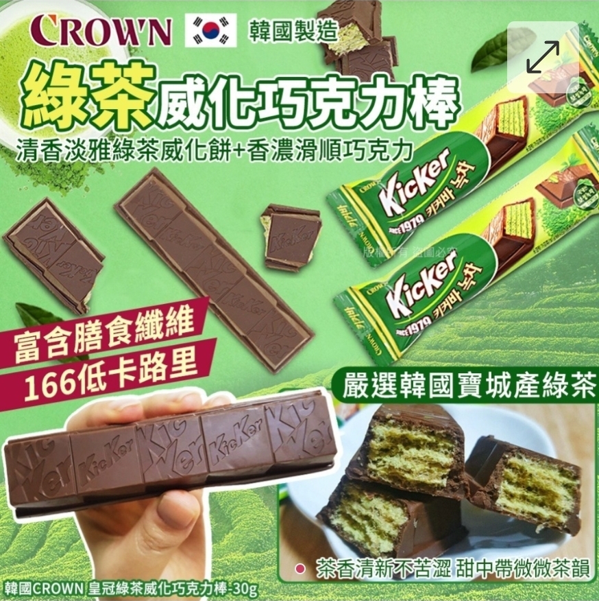 2套6包$79。韓國 CROWN 皇冠綠茶威化巧克力棒 30g (1套3包)