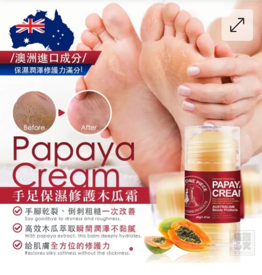 2支$60, 澳洲 手足保濕修護木瓜霜 ⛔截單日期:2025/11/02 06:00PM 📦預計貨到日:12月尾 冬季手足乾裂救星🧴 🌿澳洲進口配方|全家都能用的保濕修護霜 ❄️乾冷季節到了,你家也開始「乾到裂開」了嗎? 天氣一冷,手變乾、腳龜裂、膝蓋白白一層皮、手指倒刺超痛🥲 這瓶【Papaya Cream 澳洲進口手足保濕修護木瓜霜】 根本是從長輩到小孩都愛用的「冬天修護神物」 🧡澳洲進口木瓜萃取 × 凡士林保濕膜 💧木瓜萃取|富含維他命A、C與天然酵素,幫助肌膚代謝柔嫩細滑 💧凡士林|形成保護膜,防止乾裂、鎖住水分超保濕 💧乙基己基棕櫚酸酯|延展好、不黏膩、瞬間吸收 ✨擦上立刻潤!乾癢粗糙立即舒緩~ 皮膚摸起來滑順柔嫩超有感! 🙌旋轉棒設計|不沾手、好攜帶 不必再擠、不用沾手! 一轉一抹即潤💦 外出補水也不怕黏手💅 📍放包包、車上、辦公室都方便 📍大人、長輩、小孩都能安心使用 👪全家適用|一家一瓶剛剛好 👵 阿嬤手肘乾裂、手背粗糙 👶 小孩冬天洗手後紅紅脫皮 👨 爸爸腳跟龜裂、膝蓋粗皮 👉 一瓶全家都能用,保濕修護一次搞定! 🌸四季皆可用|冬天保濕 夏天舒緩 冬天防乾防裂、夏天曬後舒緩 不油膩、不沾手,擦完立刻能做事 一瓶隨身帶著走,肌膚隨時柔嫩不間斷✨ 💛澳洲進口木瓜成分|深層保濕修護 💛旋轉式不沾手設計|隨手一擦即潤 💛全家適用|手足乾裂救星 這個冬天,讓全家人都柔嫩不乾裂~🥰 🧴產品資訊 容量:40g 產地:台灣(澳洲原料) 用途:手足、手肘、膝蓋、腳後跟乾裂修護 保存期限:見包裝標示 ==⚠️ 聲明 ⚠️== 1.本貨品為平行進口正貨。 2.所有帖文內容只作分享及參考用途。為免混淆視聽,所有商標或版權均屬有關商品品牌商標的持有人,敬請留意。 3.空運/海運有可能因各種不明因素影響而延誤到貨,所有貨品一經訂購後,如非廠家缺貨,不設取消/退貨/換貨。 4.貨品在運輸途中導致產品包裝外盒有任何損毀凹陷,但不影響其產品本身食用/使用,或有機會不預設外盒出貨,我司不會作任何更換或退款。 5.以上資料及外盒包裝只供參考,商品外盒原廠有更換新包裝權利,一切以實物為準。 6.顏色或因拍攝器材或顯示螢幕等因素而與實物有異,以上圖片及文字僅供參考,一切以實物為準。