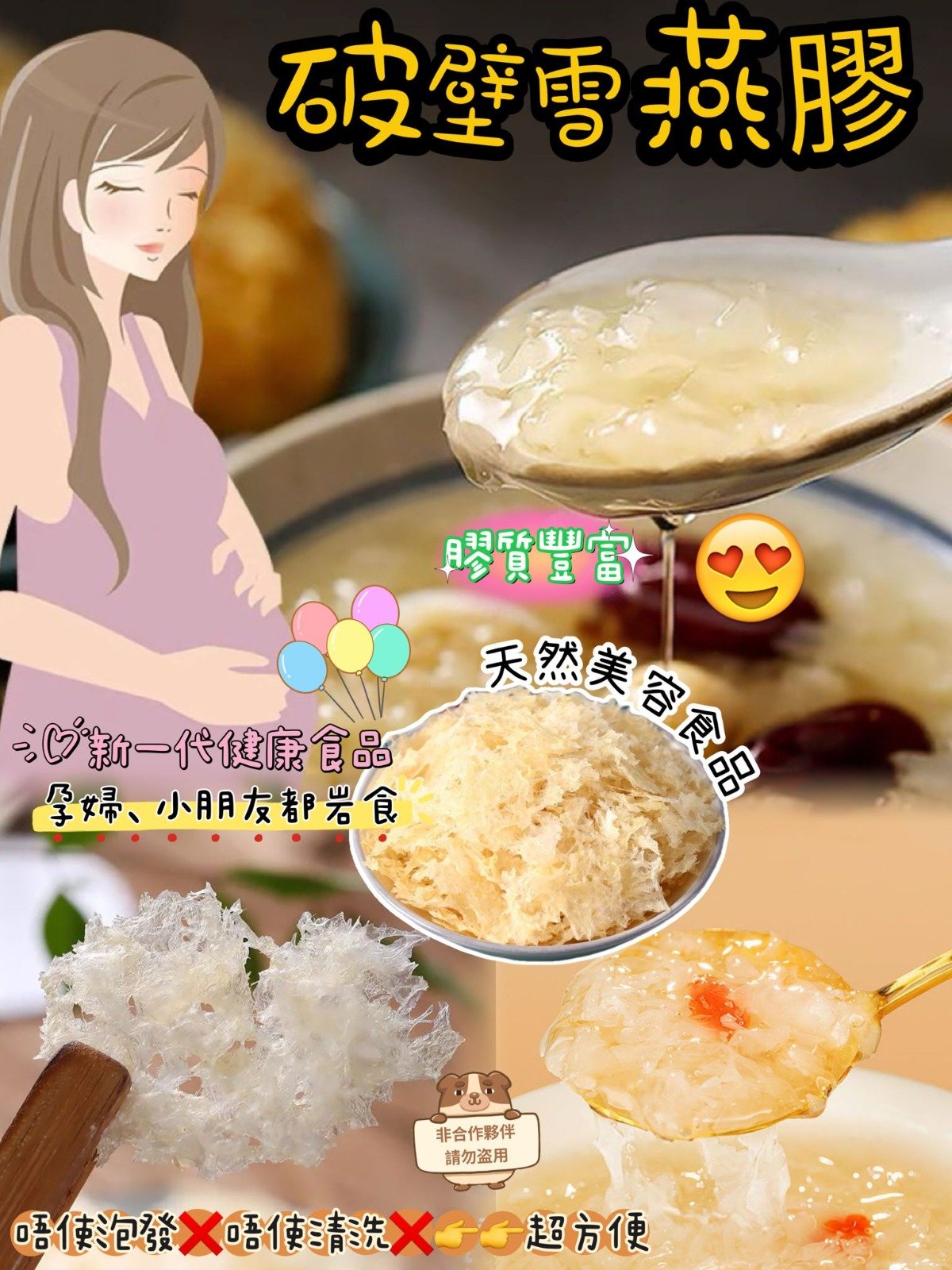 2樽$99。 破壁雪燕膠60克 /樽▶+/-5克◀ 女人的天然美容院! 一片一片的,唔使泡發、唔使清洗! 勁方便👍👍👍👍👍👍 💋💋女士恩物-免洗免浸發💋💋 💃💃溫壺焗30分即可食用💃💃 💥💥膠原滿滿💥💥 💥💥止咳化痰💥💥 💥💥滋潤肌膚💥💥 雪燕膠本身係一種天然嘅樹脂,而破壁雪燕膠採用有機培植👏破壁濃縮萃取,4倍植物膠原,更小分子吸收更好,營養更多👍味道清香,口感軟糯順滑🌈食用方法簡單😘 免洗免浸發,煮10分鐘或用保溫壺焗30分即可食用,浸發出膠率極高,最適合係辦公室吾得閒煲野既靚靚們💃💃早晚一杯,膠質超級多,潤肺滋陰,美容養顏😊 破壁雪燕膠黏性蛋白非常優質,可以媲美燕窩🙆♀具有抗氧化美容功效,仲有抗腫瘤既作用❤而膳食纖維含量有效促進腸胃蠕動,對便秘有預防和改善既作用🌈食完仲有飽腹感,係營養代餐好選擇⛹🧘♀ 食用方法百搭,可以講係懶人恩物😍焗保溫壺每次放3克就可以,一樽可以食到幾十次,超級抵食😍自已可以配搭杞子紅棗龍眼肉等等材料豐富口感,最適合怕麻煩整既野食既靚靚🧏♀ 📦規格:60克 /樽▶+/-5克◀ 🗄存放方法:存放陰涼乾爽地方,有条件存放雪櫃更佳 💁🏻食用方法:保溫壺焗或煮 (另外可以配杞子、紅棗、龍眼肉等) 📆食用期限:20/04/2026 🗄儲存方法:陰涼乾燥處 🌎原產地:中國 截單日:10月8日12:00 預計到貨日:11月底