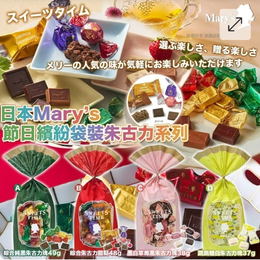 2款起各減$10。日本Mary’s 節日繽紛袋裝朱古力系列