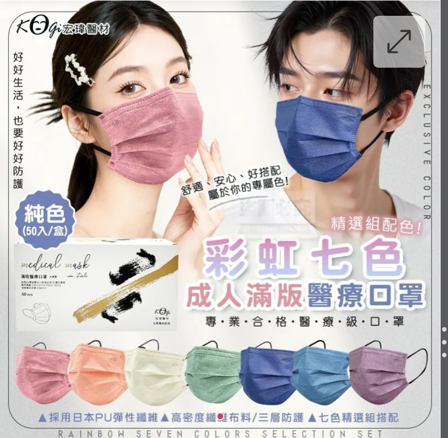 2盒$60盒.宏瑋醫材 成人醫療口罩-彩虹七色精選組50入盒1盒1色