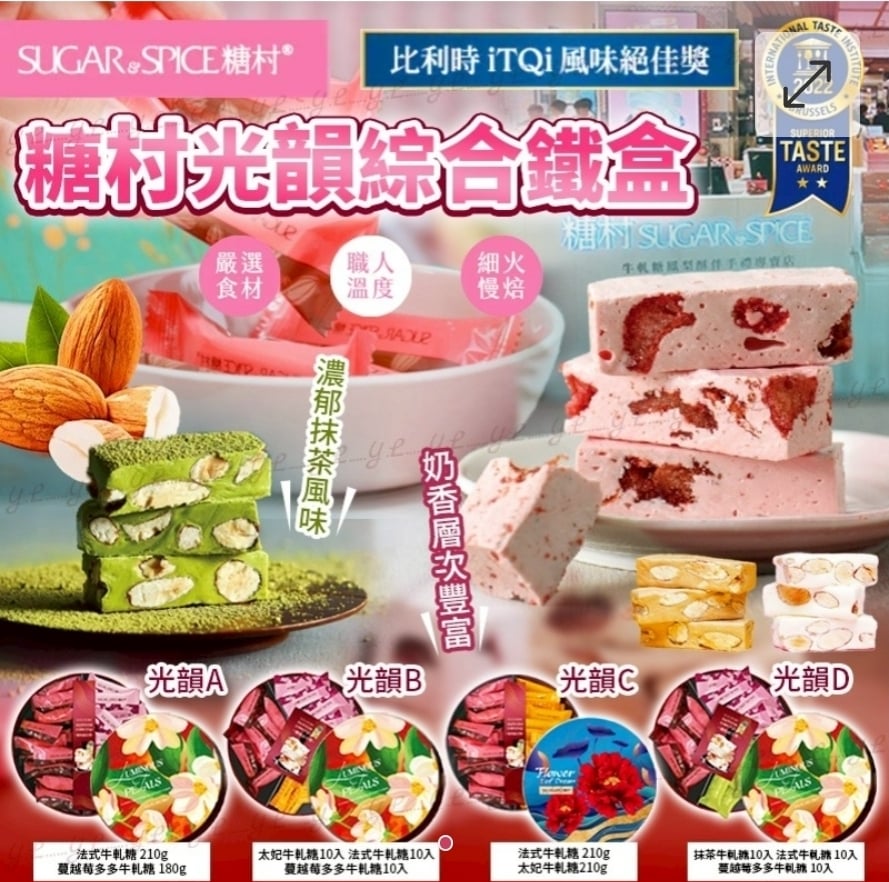 2盒起各減$ 10。 2026新年台灣糖村光韻綜合鐵盒 ⛔截單日期:2025/12/17 06:00PM 📦預計貨到日: 2月頭 光韻【A】:$185盒 光韻【B】:$188盒 花夢【C】:$188盒 光韻【D】:$202盒 🎉🔥 台灣糖村《光韻綜合鐵盒》強勢登場! 送禮界真正嘅「顏值天花板」+「味道王者」! 今年如果只買一款禮盒, 一定係佢‼️ 一開盒就贏晒全場‼️ 💎 外盒美到誇張!高貴系鐵盒設計, 放喺手上自帶光環,送禮直接升級到「VIP等級」😍 人人收到都會講: 👉「哇😍咁靚嘅!邊度買嘅?」 (面子直接升天✨) 🍬 裡面仲係台灣超人氣糖村出品, 牛軋糖香到離譜、口感軟Q到不得了、 每粒都甜度剛剛好~ 完全係會上癮嘅程度!! 光韻【A】→ 一盒雙享受!甜蜜到爆、香氣直衝鼻腔! ❶法式牛軋糖 210g、❷蔓越莓多多牛軋糖 180g 光韻【B】→ 三大口味一次過滿足!送禮完全無雷! ❶太妃牛軋糖10入、❷法式牛軋糖10入、❸蔓越莓多多牛軋糖10入 花夢【C】→ 奶香濃郁,愈嚼愈香~配茶一流! ❶法式牛軋糖 210g、❷太妃牛軋糖210g 光韻【D】→ 茶香清新+果香+奶香,味道層次誇張豐富! ❶抹茶牛軋糖10入、❷法式牛軋糖 10入、❸蔓越莓多多牛軋糖 10入 呢款真係愈睇愈靚、愈食愈停唔到! 拜年手信?送客戶?送朋友? 一盒搞掂!面子+味道雙滿分! -產地:台灣 -規格: 光韻【A】❶法式牛軋糖 210g、❷蔓越莓多多牛軋糖 180g 光韻【B】❶太妃牛軋糖10入、❷法式牛軋糖10入、❸蔓越莓多多牛軋糖10入 花夢【C】❶法式牛軋糖 210g、❷太妃牛軋糖210g 光韻【D】❶抹茶牛軋糖10入、❷法式牛軋糖 10入、❸蔓越莓多多牛軋糖 10入 -保存期限:生產計起65天(商品銷售速度快,依實際出廠為主) -保存方式:避免陽光直射,請置於陰涼乾燥 -過敏原資訊:本產品含麩質之穀物、牛奶、蛋、大豆及其製品,不適合其過敏體質食用 ==⚠️ 聲明 ⚠️== 1.本貨品為平行進口正貨。 2.所有帖文內容只作分享及參考用途。為免混淆視聽,所有商標或版權均屬有關商品品牌商標的持有人,敬請留意。 3.空運/海運有可能因各種不明因素影響而延誤到貨,所有貨品一經訂購後,如非廠家缺貨,不設取消/退貨/換貨。 4.貨品在運輸途中導致產品包裝外盒有任何損毀凹陷,但不影響其產品本身食用/使用,或有機會不預設外盒出貨,我司不會作任何更換或退款。 5.以上資料及外盒包裝只供參考,商品外盒原廠有更換新包裝權利,一切以實物為準。 6.顏色或因拍攝器材或顯示螢幕等因素而與實物有異,以上圖片及文字僅供參考,一切以實物為準。