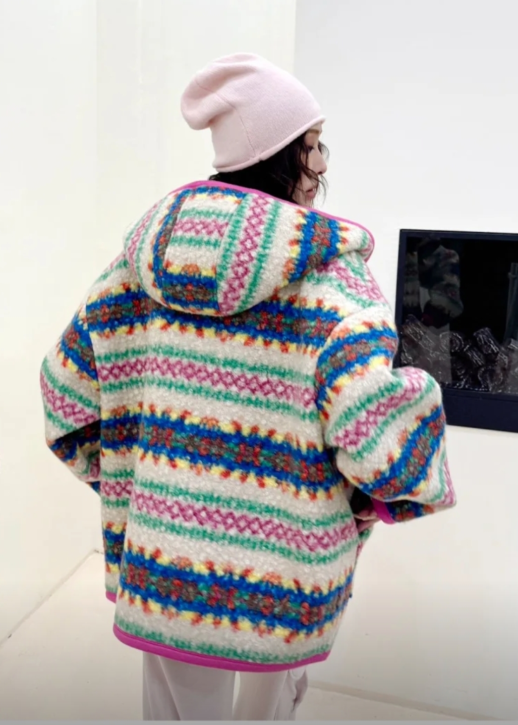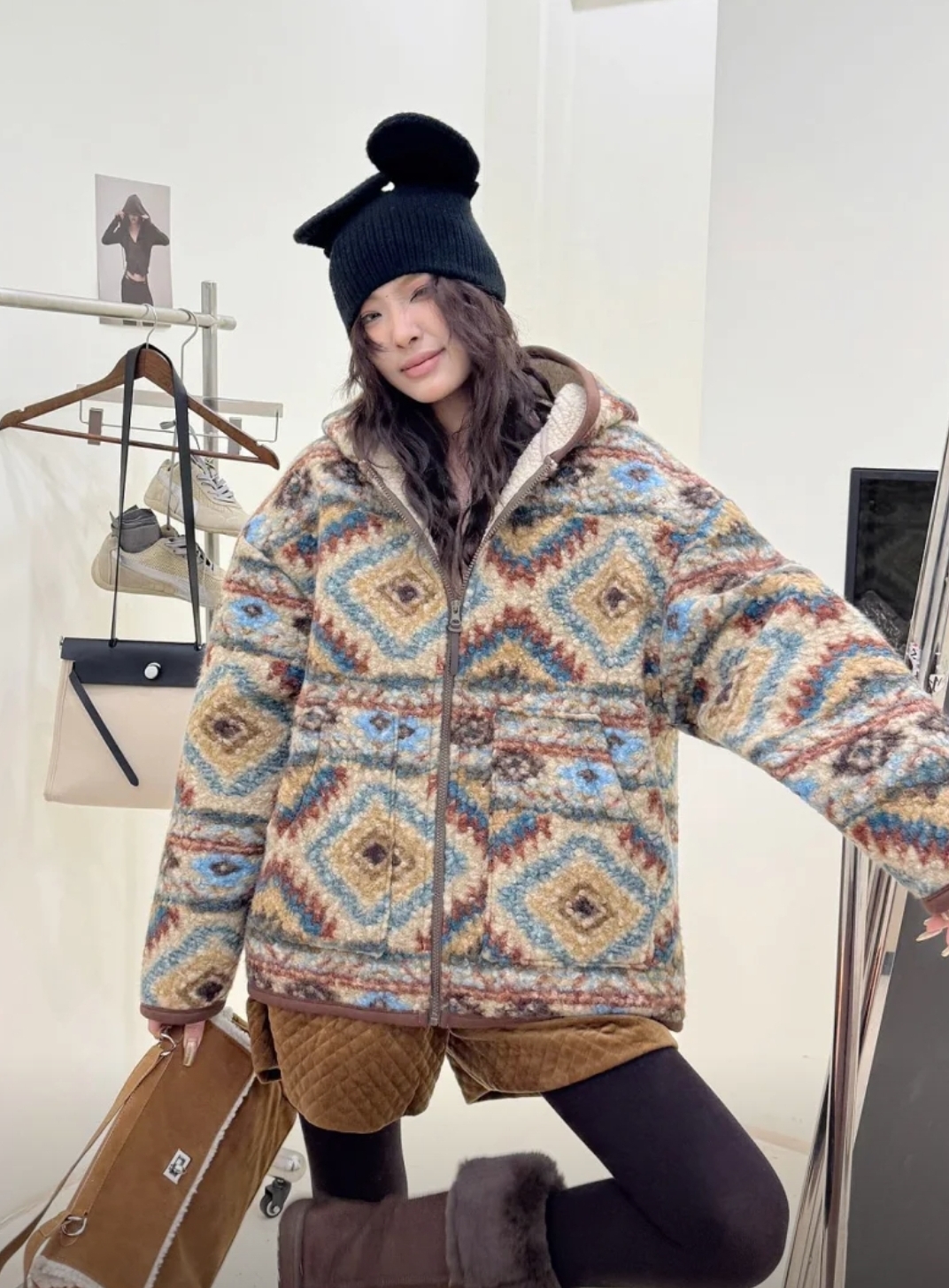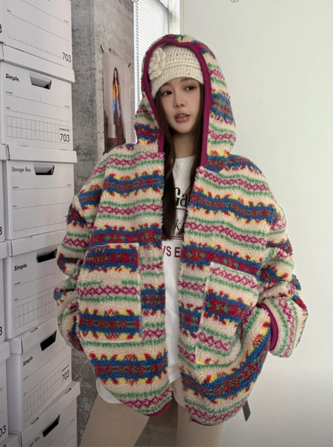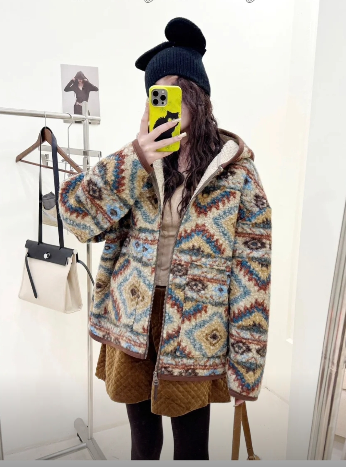 3款選擇/$168件。2件起$158件。 ❄️ 民族風羊羔絨連帽外套|暖笠笠・超有型 ❄️ 一著上身即刻有 冬日氛圍感!厚實羊羔絨配合彩色民族圖騰/條紋設計,復古又可愛,出街影相超吸睛📸 ✨ 產品亮點 🧸 高密羊羔絨:柔軟親膚、保暖度高 🧥 連帽設計:防風鎖溫,秋冬必備 🎨 民族圖騰/條紋元素:復古時尚,唔怕撞款 🧵 寬鬆版型:遮肉顯瘦,入面疊穿都OK 👖 百搭易襯:牛仔褲/裙/打底褲都好睇 📏 尺寸(均碼) 胸圍:129cm 衣長:70cm 👉 適合想要 Oversize 感 嘅你 🧣 穿搭建議 配冷帽+打底衫=休閒街頭風 配針織帽+短裙=甜酷混搭