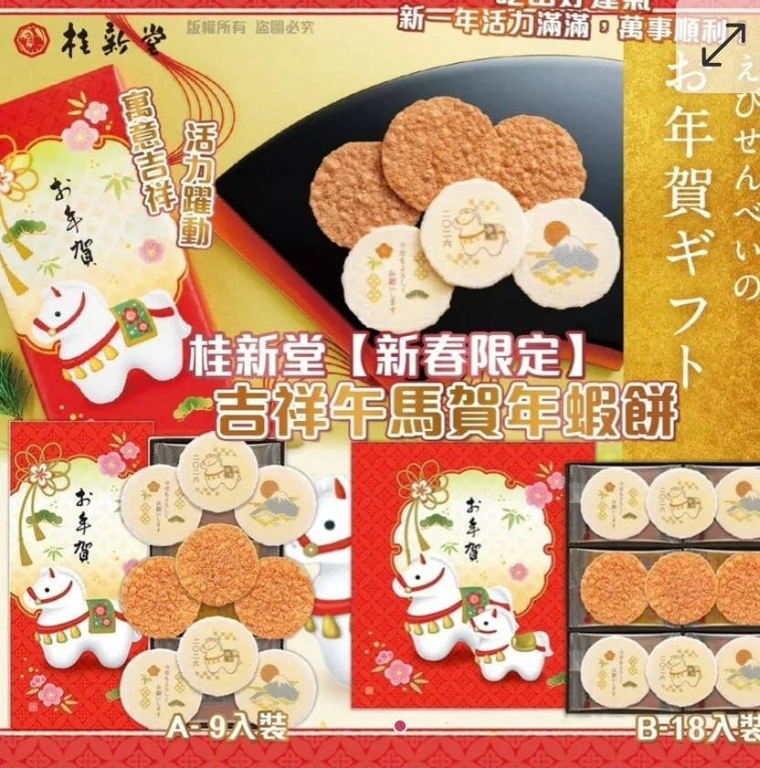 A- 9 入裝 $105.B-18 入裝 $168.買2件起每件優惠$10日本桂新堂2026馬年限定福蝦餅