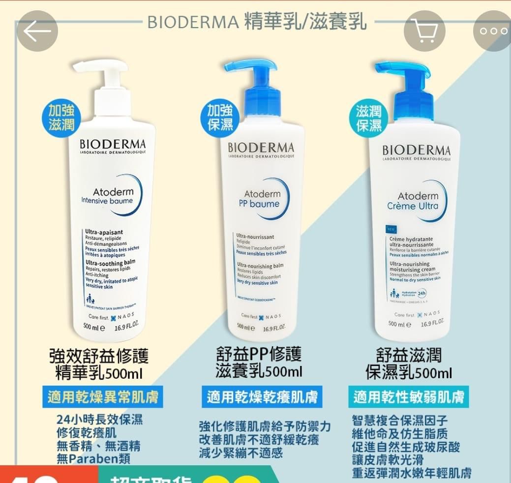 Bioderma 滋潤全日保濕霜 💰$115現貨 乾肌寶寶必備!季節交際的時候,肌膚最容易出問題!有貝膚黛瑪 滋潤全日保濕霜就不用擔心啦! 有效滋養乾燥肌膚,沐浴後於微微濕潤的皮膚塗抹效果更棒!天天使用,肌膚擁有的豐潤感絕對讓妳驚為天人。 👉🏻易於推開的質地可迅速被皮膚吸收,解救您的乾燥肌膚帶來即時舒適感,皮膚立即得到持久的補水、滋養和保護 👉🏻所有肌膚適用 👉🏻即時:保濕 24 小時,並用Omaga 3、6 和 9 滋養皮膚 👉🏻長效:肌膚保養科技,通過刺激透明質酸的自然生成來保持皮膚持續滋潤,並通過Niacinamide增強皮膚屏障,滋潤全日保濕霜含滋潤及重整配方 👉🏻增強皮膚天然防禦系統,阻擋外來刺激物滲透。 Skin Protect Complex™️專利含有維他命PP和2種醣的物理和生物學組合,可重現健康的皮膚屏障,並有助於保持皮膚的水分儲備,從而使皮膚再次舒適。維他命PP通過刺激脂質的合成,有助於重組皮膚屏障,從而改善皮膚的柔軟度,並保持舒適感。醣類的組合優化了皮膚的水分儲備,並促進了水分通過皮膚層的流動,可提供24小時的深層補水!當中甘油和凡士林可通過吸收體外水分,而改善皮膚水分不足的問題。D.A.F™️專利可提高皮膚的耐受性。 使用方法: 步驟 1取適量塗於清潔的皮膚上,可用於面部及身體。於微微濕潤的皮膚上塗抹會更吸收 步驟 2輕輕按摩至完全吸收 📏500ml 🇫🇷 產地法國 新版) EXP:2028/01 --------- BIODERMA 貝德瑪 PP身體乳 500ML (單支) 💰$148 現貨 煙酰胺保濕修護,濕疹護理,乾燥護理系列。 詳細介紹 功效: 紓緩鎮定刺激性及痕癢皮膚、防止復發 修復及加強皮膚天然保護屏障 為皮膚提供持久及強效的保濕和修護 質地細滑、易於吸收 適合成人、小童及嬰兒使用 專門為乾燥及濕疹敏感皮膚而設 如何使用: 潔臉後,均勻塗於臉部,輕撫至完全吸收。建議每天使用一至兩次。 EXP:2028/04