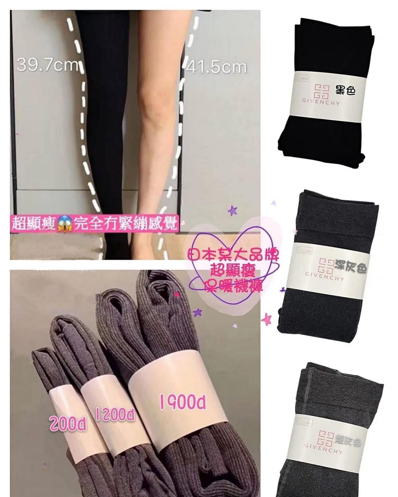 Givenchy保暖瘦腿襪褲 2件起各減物10, 200D $45。 1200D $50。 1900D $59。 截單日期:長訂 逢星期一11am / 售完即止 預計到貨日:3-6星期 幾十蚊買對靚啲嘅絲襪都唔得啦,而家幾十蚊買到有牌子又保暖又超顯瘦嘅襪褲😍仲諗❓快手搶啦‼️‼️ 💃🏻著上身 #超顯瘦超級顯瘦 完全唔會有緊繃同勒住勒住嘅感覺❗內裏嘅(絨貂毛)觸感非常細膩👍無論係腿部定腰腹部都會feel到非常舒服到一個點🤩著一天都唔會掉檔,仲要超百搭❣一款好嘅打底褲真係可以著好幾年都 #唔過時,#唔起毛球 #唔掉檔👍再寒冷嘅天氣都唔怕啦💁🏻好溫暖啊☀呢個冬天你又點可以唔留定1-2條係屋企啊😆 Free Size 80kg至140kg都可以著 3️⃣款厚度選擇✨ 200D 1200D 加厚 1900D 加厚 3️⃣色選擇✨ 黑色、深灰色、煙灰色 ‼️此乃平行進口/出口廠貨,不經專門店,介意者請勿選購 ‼️本店屬代購角色,所有有關貨品之責任,例如品質、真偽等,本店將不會作出任何承擔或法律責任 ‼️ 品牌產品於各地區使用之配方有所不同,平行進口產品批次從各國出口,產品外形、包裝、氣味、質地等或有不同,所以可能與不同地方專門店/行貨略有不同,不能因此要求退款或退貨。 ‼️原單有機會剪標或換標,可能會有小瑕疵或線頭,完美主義者請繞道。