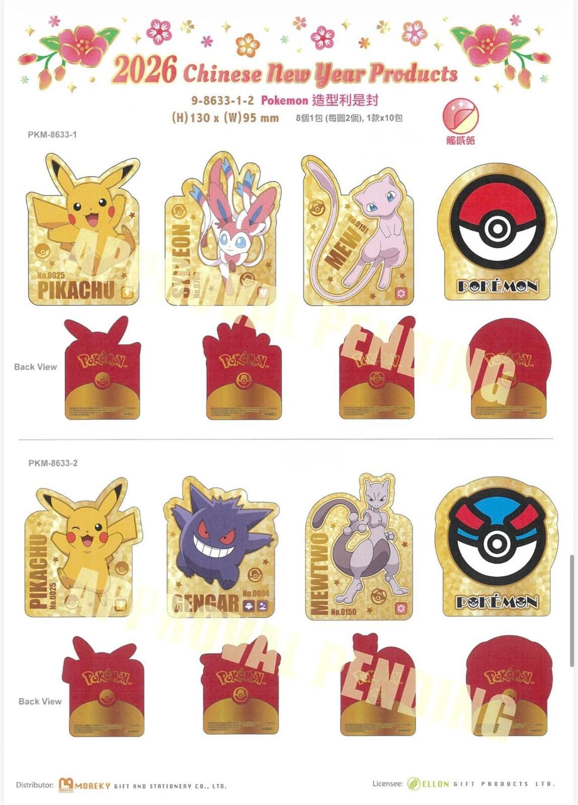 Pokemon 2026年港版利是封系列 (1包8個)$38包/單款。2包起$30包。