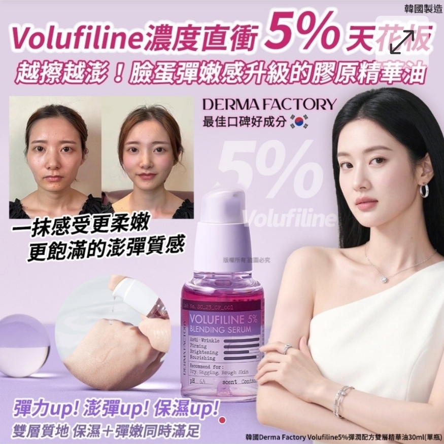 $65支. 2支或以上:$55支. 韓國 Derma Factory Volufiline 5% 彈潤配方雙層精華油 30ml⁸ ⛔截單日期:2025/12/15 06:00PM 📦預計貨到日: 2月尾 5%!5%!5%! 在市面上要找到 Volufiline 含量高到 5% 的精華 真的.超.難.找! (很多都只有 1%、2%…這瓶直接做到五倍的誠意😳🔥) 💜🌟 雙層澎彈威力太強! 膠原蛋白水層 × Volufiline 油層 黃金比例調和,搖一搖立刻變「澎彈牛奶精華」 上臉那個彈潤感真的超明顯~ 柔嫩、亮澤、澎澎的水嫩感直接回來 ✨ 💎 有效成分含量 92.1%!真的豪氣到不行 ✔ 膠原蛋白 60% ✔ Volufiline 專利成分 5% ✔ 植物油保濕成分 整瓶幾乎都是重點成分,完全不跟你客氣! 難怪擦起來就是有種 “欸?今天臉怎麼覺得很澎?” 的感覺😏💕 🇫🇷 使用法國 Sederma 原廠 Volufiline™️ 這個成分就是專門做「彈潤感」的~ 連研究都指出: 只要一個月,皺紋間距看起來更緊緻! (是不是很欠收一瓶回家?) ✨ 質地超好!搖一搖變成水光彈潤精華~ 透明水層 × 淡紫色油層 美到像仙女混合飲,一抹水感、後段柔嫩、 最後留下一個閃亮潤澤的光澤,妝前用超讚! 💖 一瓶多效修護:亮感 × 彈力 × 柔嫩 乾燥肌、粗糙肌、鬆垮肌 全都適合! 妳想要那種「看起來精神好+保養有在做」的亮澤感, 這瓶真的直接給足! 💧 使用方式也超簡單: 搖勻 → 按壓 → 上臉 想加強就直接疊!乾肌用會一秒愛上😍 -規格:30ml -產地:韓國 ==⚠️ 聲明 ⚠️== 1.本貨品為平行進口正貨。 2.所有帖文內容只作分享及參考用途。為免混淆視聽,所有商標或版權均屬有關商品品牌商標的持有人,敬請留意。 3.空運/海運有可能因各種不明因素影響而延誤到貨,所有貨品一經訂購後,如非廠家缺貨,不設取消/退貨/換貨。 4.貨品在運輸途中導致產品包裝外盒有任何損毀凹陷,但不影響其產品本身食用/使用,或有機會不預設外盒出貨,我司不會作任何更換或退款。 5.以上資料及外盒包裝只供參考,商品外盒原廠有更換新包裝權利,一切以實物為準。 6.顏色或因拍攝器材或顯示螢幕等因素而與實物有異,以上圖片及文字僅供參考,一切以實物為準。